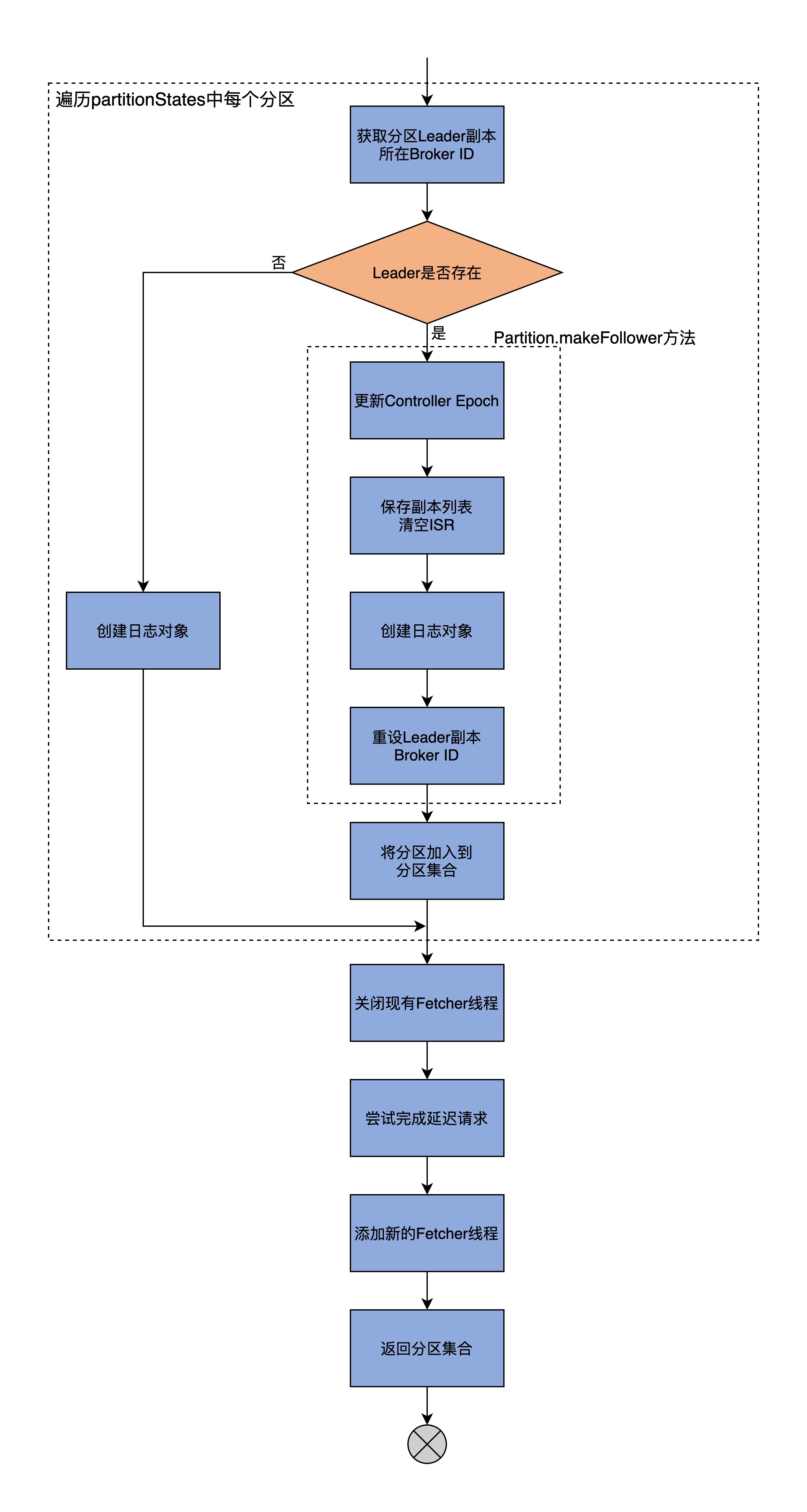 然后,becomeLeaderOrFollower方法会更新当前缓存的Controller Epoch值,再提取出LeaderAndIsrRequest请求中涉及到的分区,之后依次遍历这些分区,并执行下面的两步逻辑。
