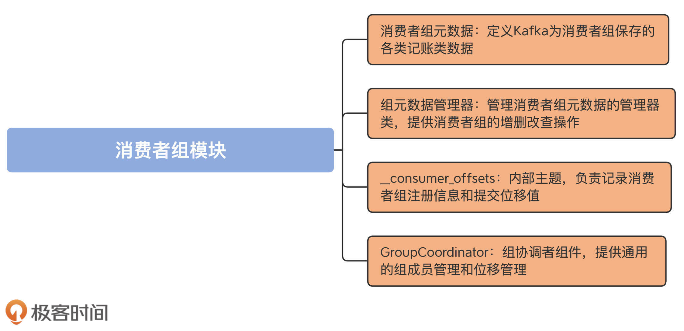 我先来给你简单介绍下这4部分的功能,以方便你对消费者组管理有一个大概的理解。