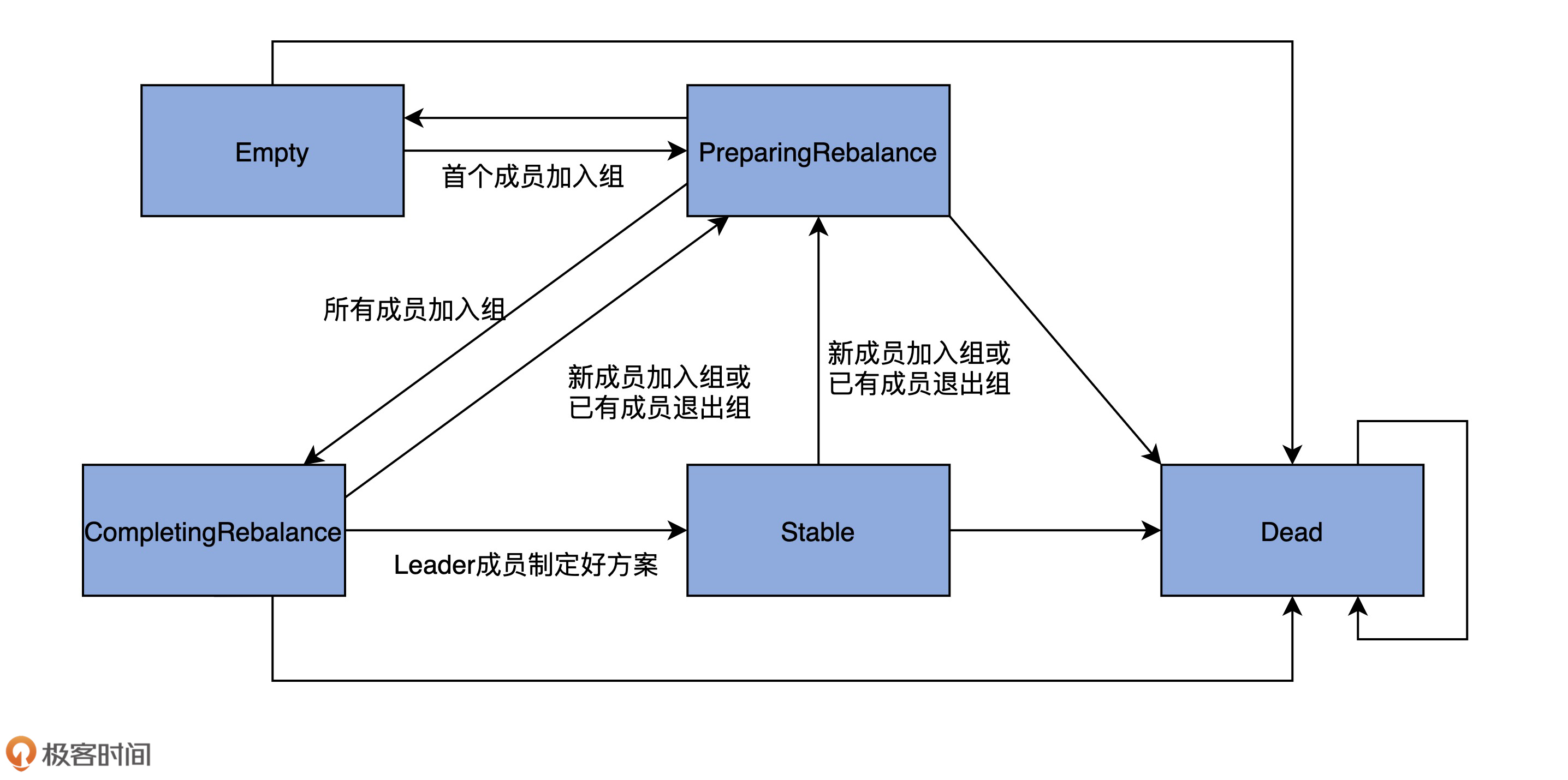这里我只展示了Stable状态的代码,其他4个状态的代码都差不多。为了方便你理解消费者组之间的状态流转,我绘制了一张完整的状态流转图。