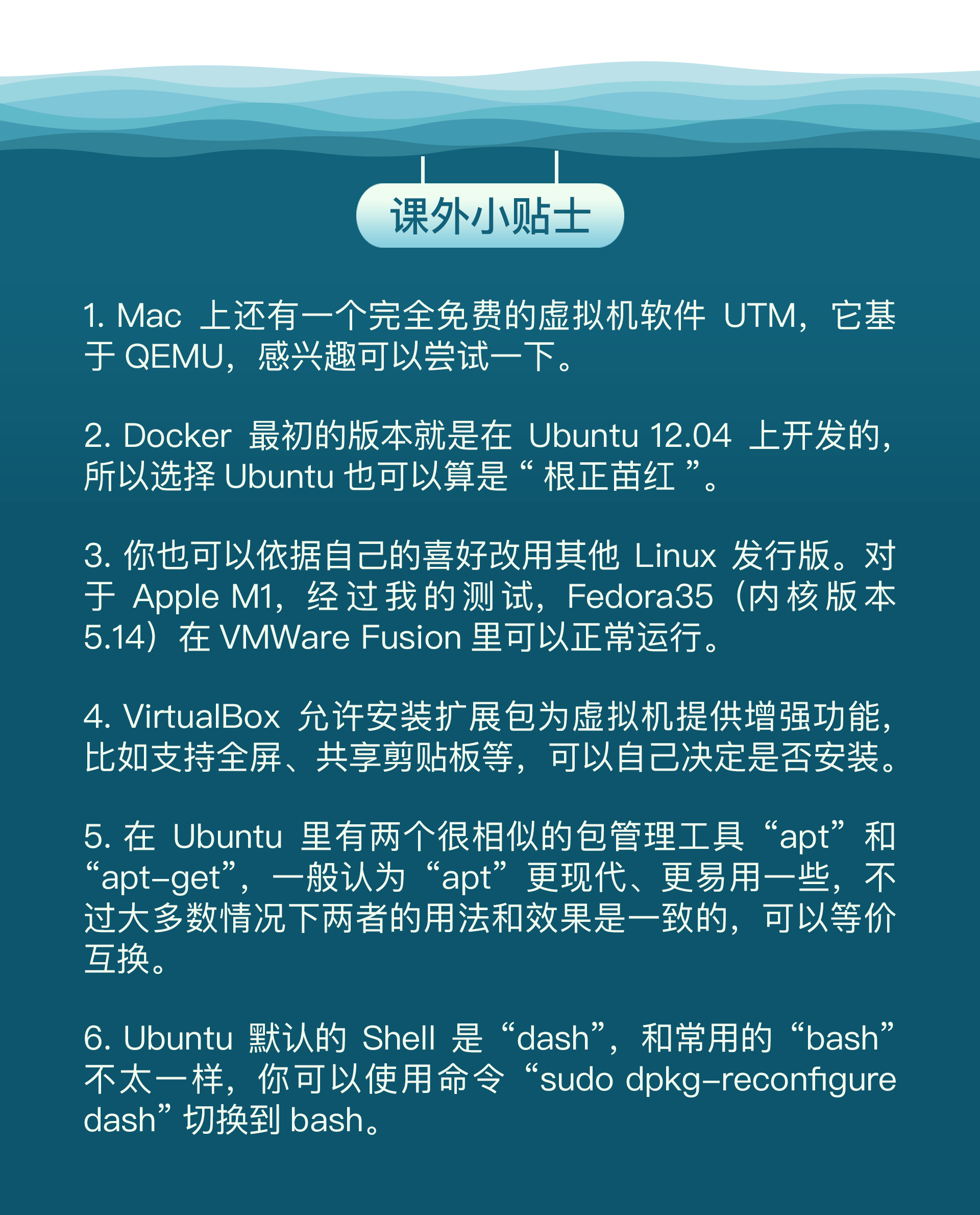 最后是课下作业时间,请实际动手操作,在你自己的电脑上用虚拟机搭建出Linux实验环境,为下一节课正式学习Docker做好准备。