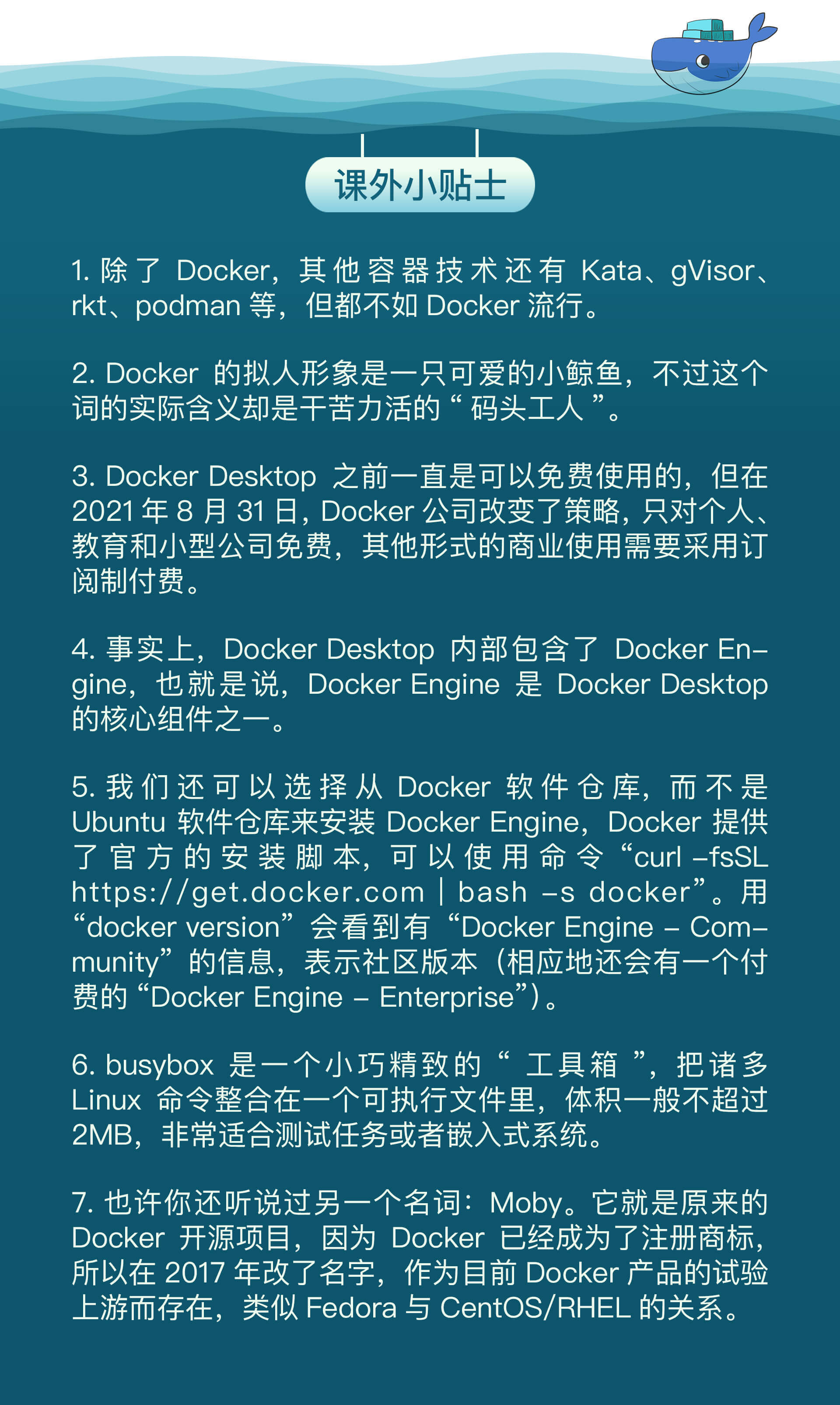 所以,在接下来的学习过程里,我推荐使用Docker Engine,之后在本专栏内,如果没有什么特别的声明,Docker这个词通常指的就是Docker Engine。