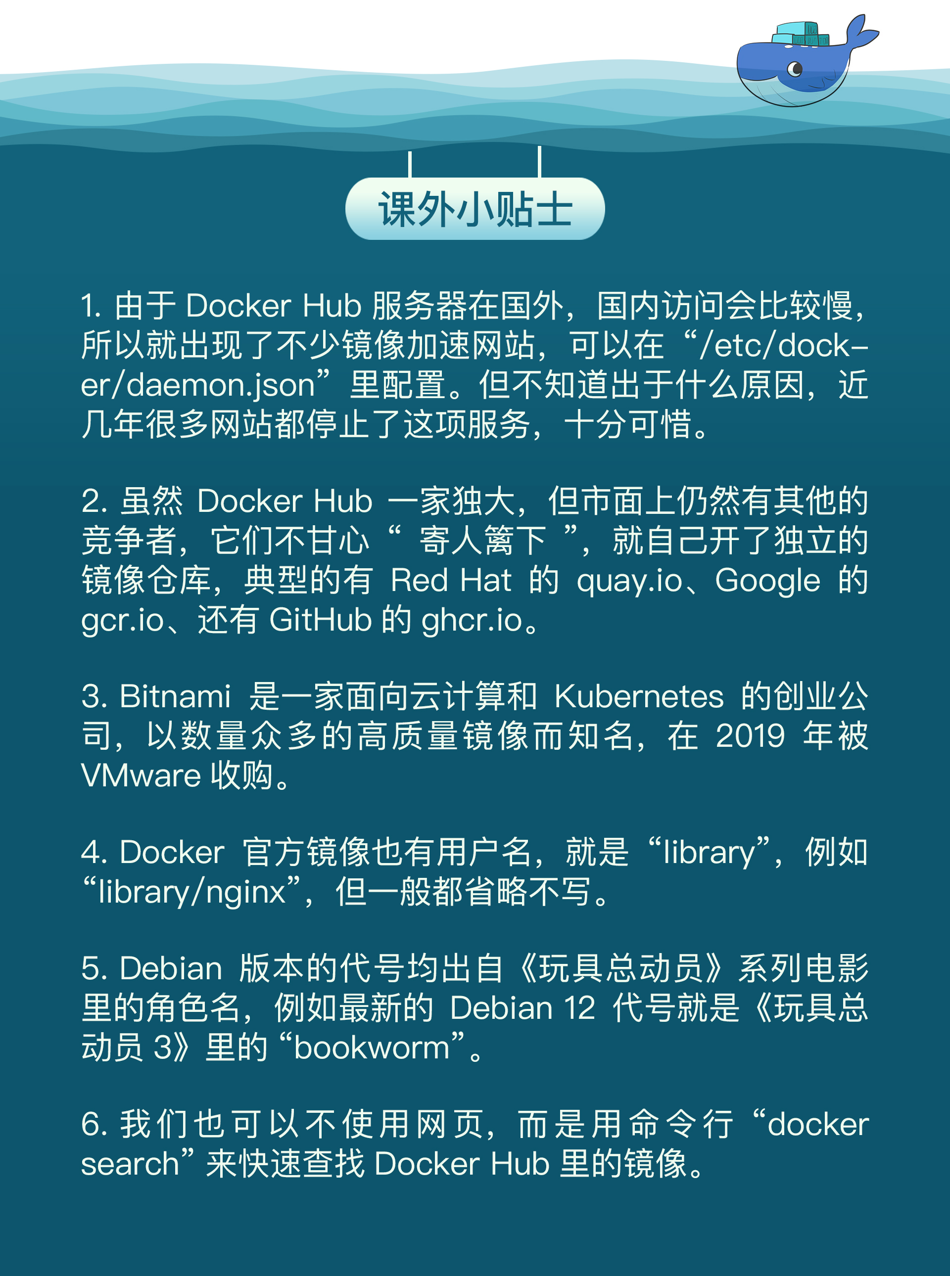 好了,今天我们一起学习了镜像仓库,了解了Docker Hub的使用方法,整理一下要点方便你加深理解: