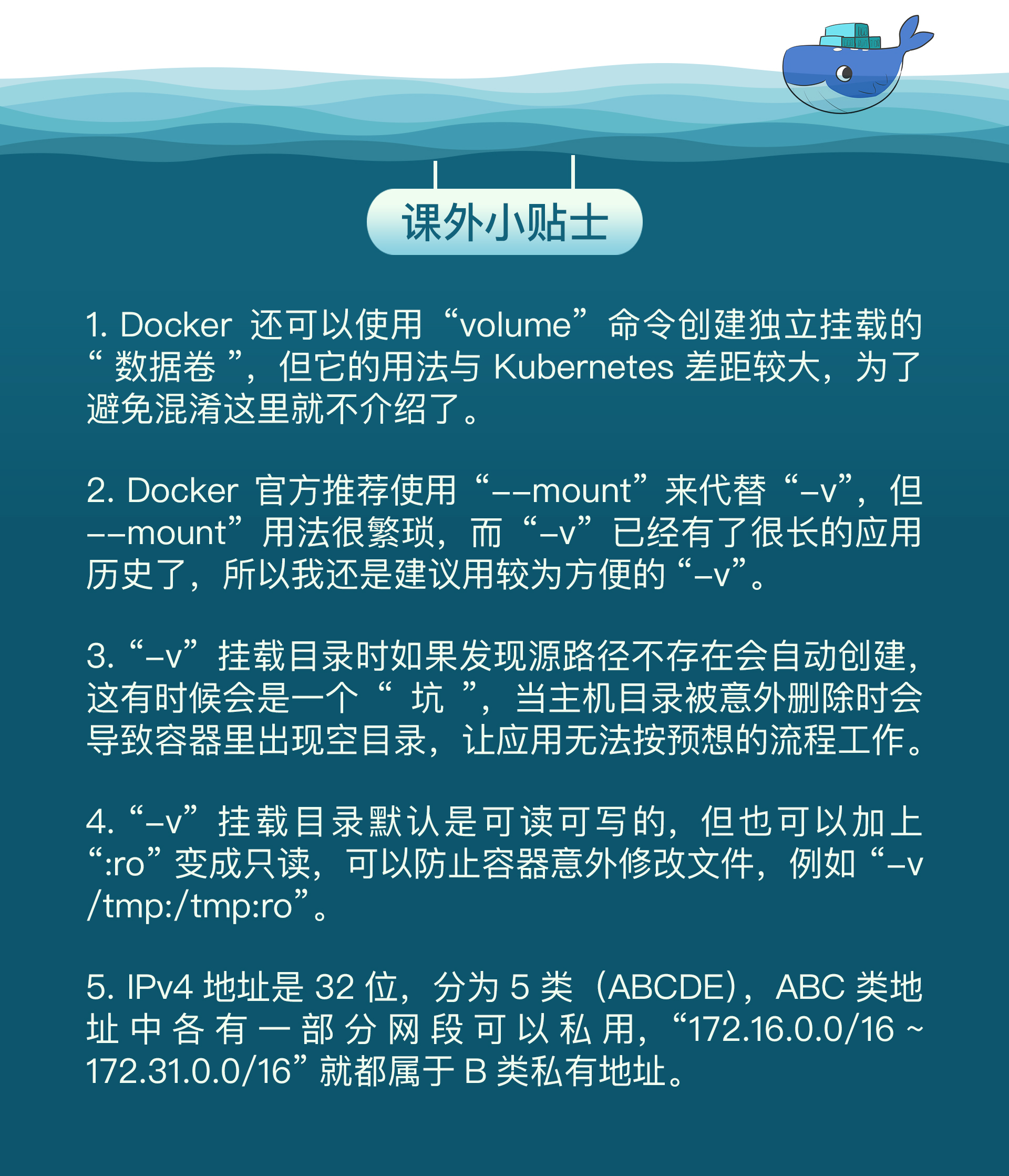 docker cp 命令可以在容器和主机之间互相拷贝文件,适合简单的数据交换。docker run -v 命令可以让容器和主机共享本地目录,免去了拷贝操作,提升工作效率。docker run -p 命令可以把主机的端口号映射到容器的内部端口号,解决了潜在的端口冲突问题。最后是课下作业时间,给你留两个思考题: