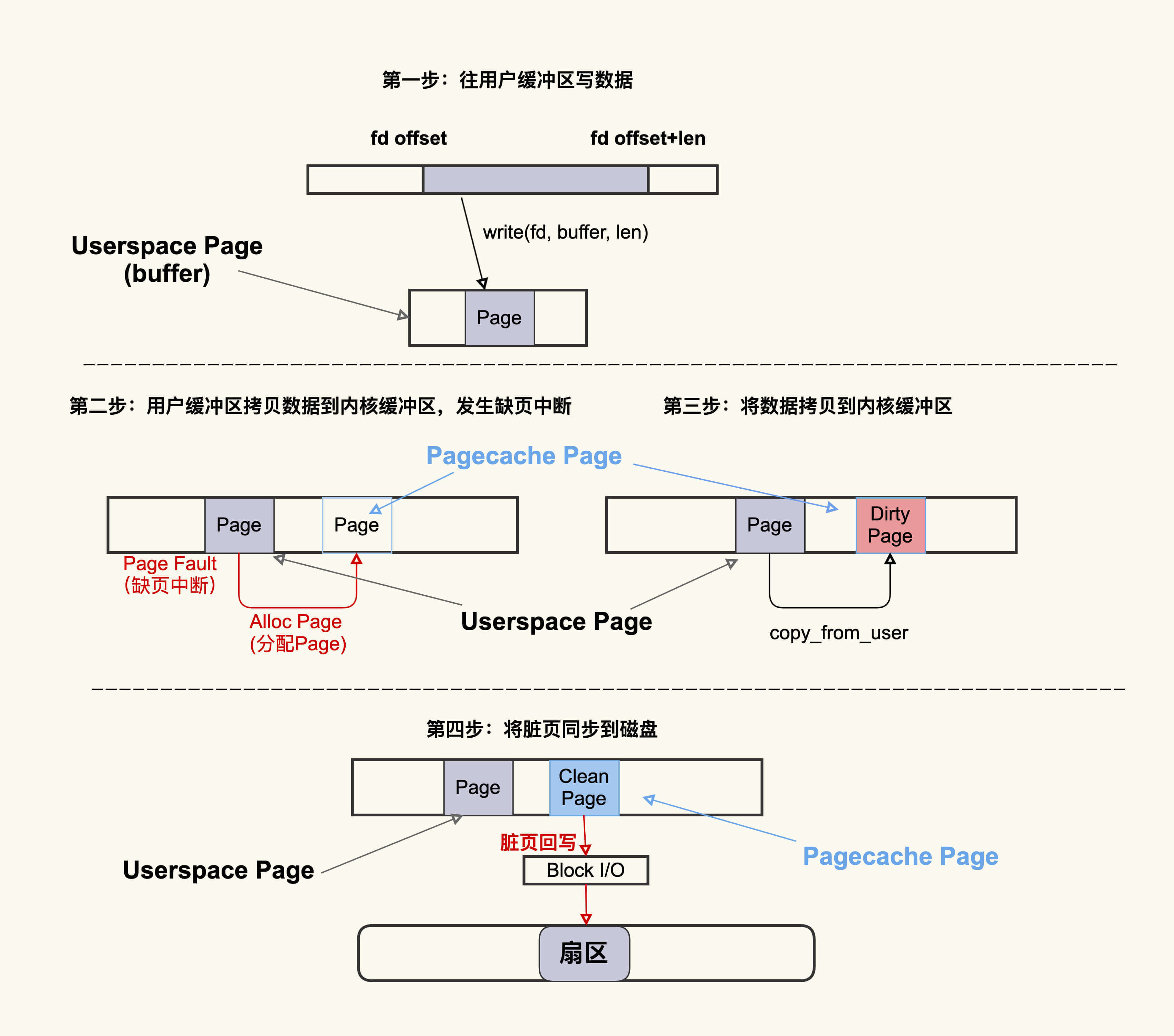这个过程大致可以描述为:首先往用户缓冲区buffer(这是Userspace Page)写入数据,然后buffer中的数据拷贝到内核缓冲区(这是Pagecache Page),如果内核缓冲区中还没有这个Page,就会发生Page Fault会去分配一个Page,拷贝结束后该Pagecache Page是一个Dirty Page(脏页),然后该Dirty Page中的内容会同步到磁盘,同步到磁盘后,该Pagecache Page变为Clean Page并且继续存在系统中。