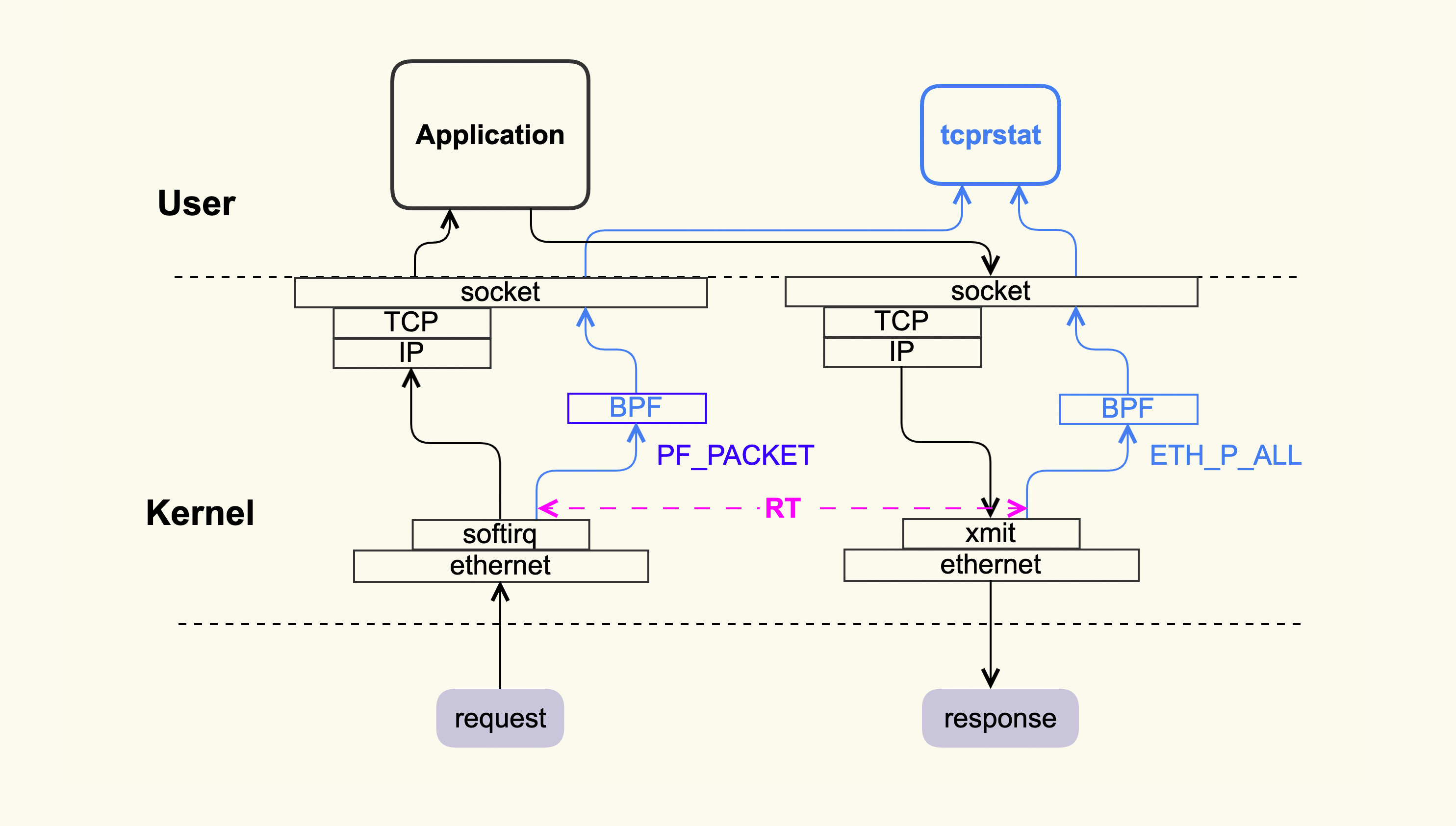 tcprstat会有这么高的CPU开销,原因其实与tcpdump是类似的,它在旁路采集数据后会拷贝到用户空间来处理,这个拷贝以及处理时间就比较消耗CPU。