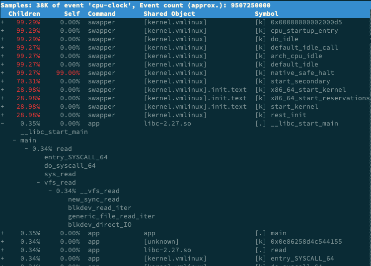所以,分析案例时,我们直接忽略了前面这个 99% 的符号,转而分析后面只有 0.3% 的 app。其实从这里你也能理解,为什么我们一开始不先用 perf 分析。