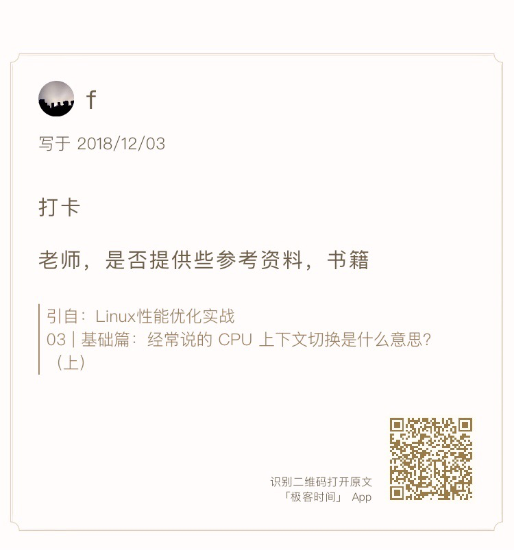 我很高兴看到留言有这么高的学习热情,其实好多文章后面都有大量留言,希望我能推荐书籍和学习资料。这一点也是我乐意看到的。专栏学习一定不是你性能优化之旅的全部,能够带你入门、帮你解决实际问题、甚至是激发你的学习热情,已经让我非常开心。