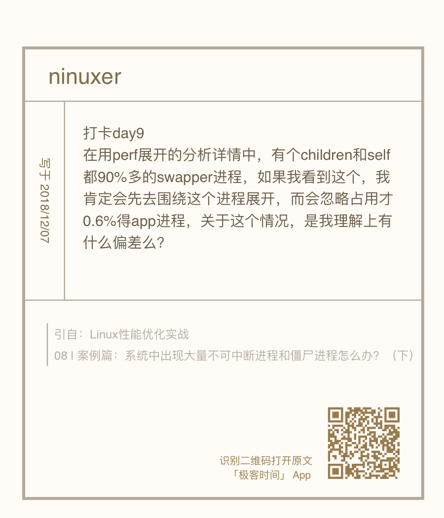 在问题4的perf report 界面中,你也一定注意到了, swapper 高达 99% 的比例。直觉来说,我们应该直接观察它才对,为什么没那么做呢?