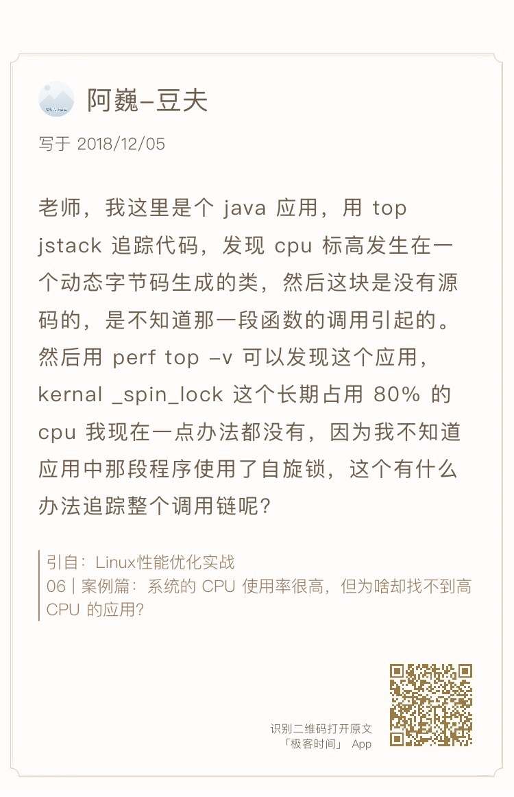 说到这里,我也想强调一个问题,那就是学习性能优化时,不要一开始就把自己限定在具体的某个编程语言或者性能工具中,纠结于语言或工具的细节出不来。