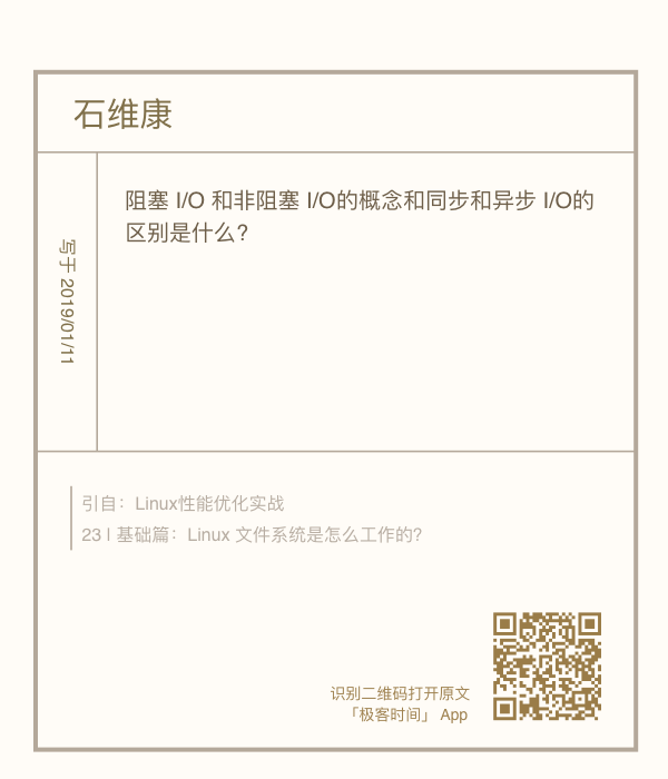 在文件系统的工作原理篇中,我曾经介绍了阻塞、非阻塞 I/O 以及同步、异步 I/O 的含义,这里我们再简单回顾一下。