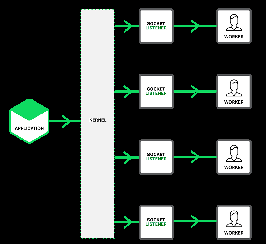 第二种,监听到相同端口的多进程模型。在这种方式下,所有的进程都监听相同的接口,并且开启 SO_REUSEPORT 选项,由内核负责将请求负载均衡到这些监听进程中去。这一过程如下图所示。