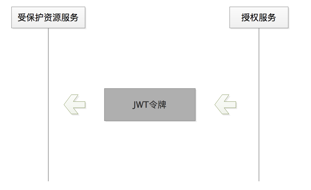 有了 JWT 令牌之后的通信方式,就如下面的图 3 所展示的那样了,授权服务“扔出”一个令牌,受保护资源服务“接住”这个令牌,然后自己开始解析令牌本身所包含的信息就可以了,而不需要再去查询数据库或者请求 RPC 服务。这样也实现了我们上面说的令牌内检。