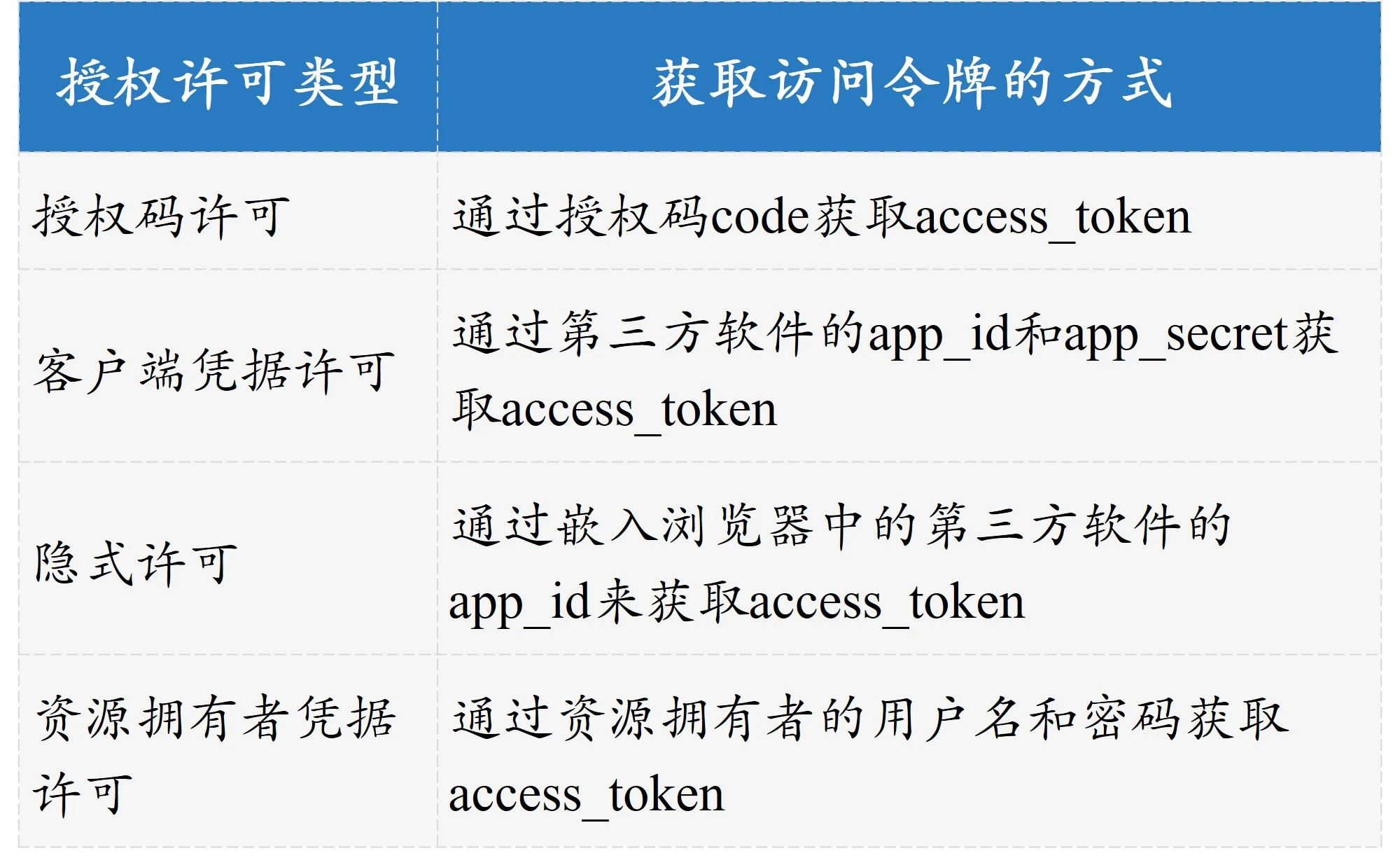 加上前面我们讲的授权码许可类型,我们一共讲了 4 种授权许可类型,它们最显著的区别就是获取访问令牌 access_token 的方式不同。最后,我通过一张表格来对比下: