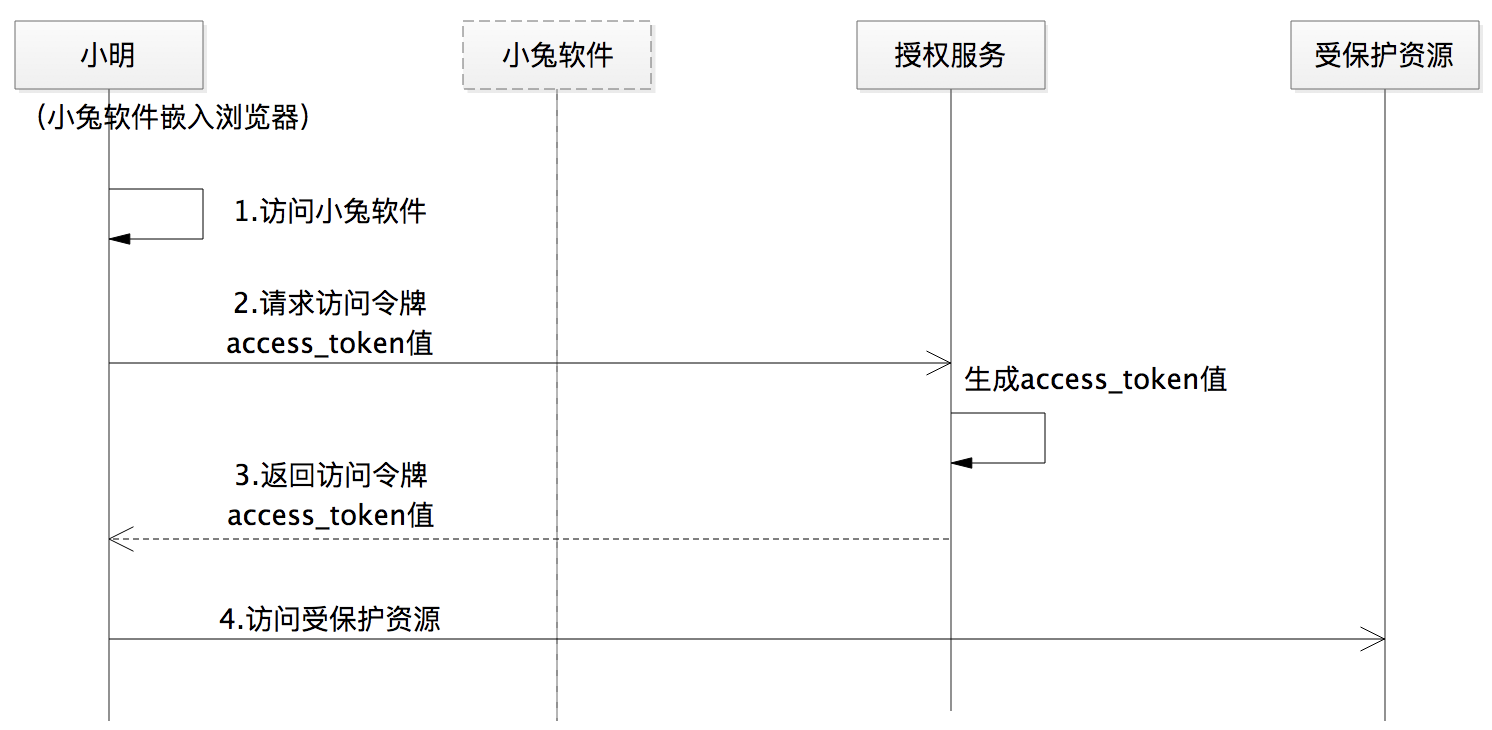 其实,这种情况下的授权流程就可以使用隐式许可流程,可以理解为第三方软件小兔直接嵌入浏览器中了。