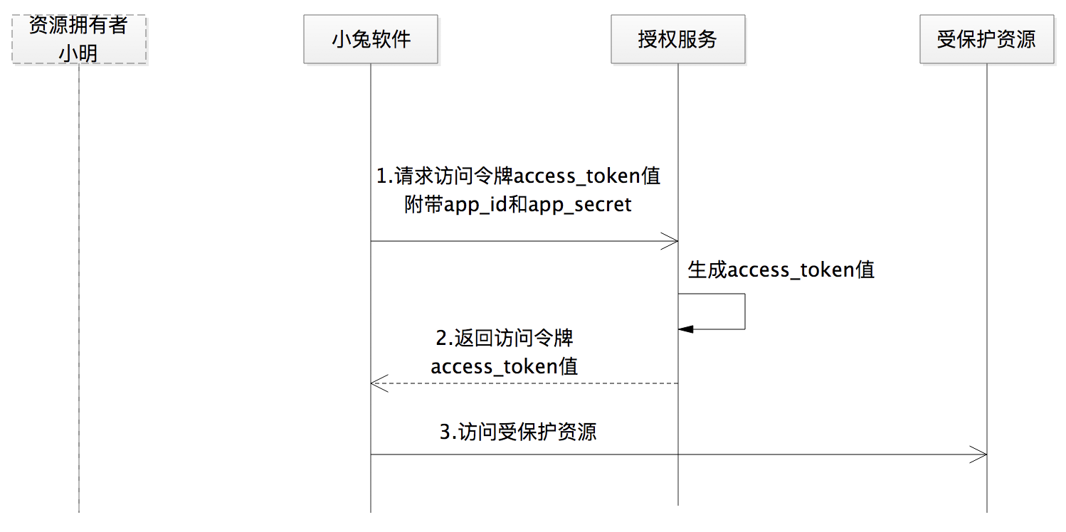 我们还是以小明使用小兔软件为例,来看下客户端凭据许可的整个授权流程,如下图所示: