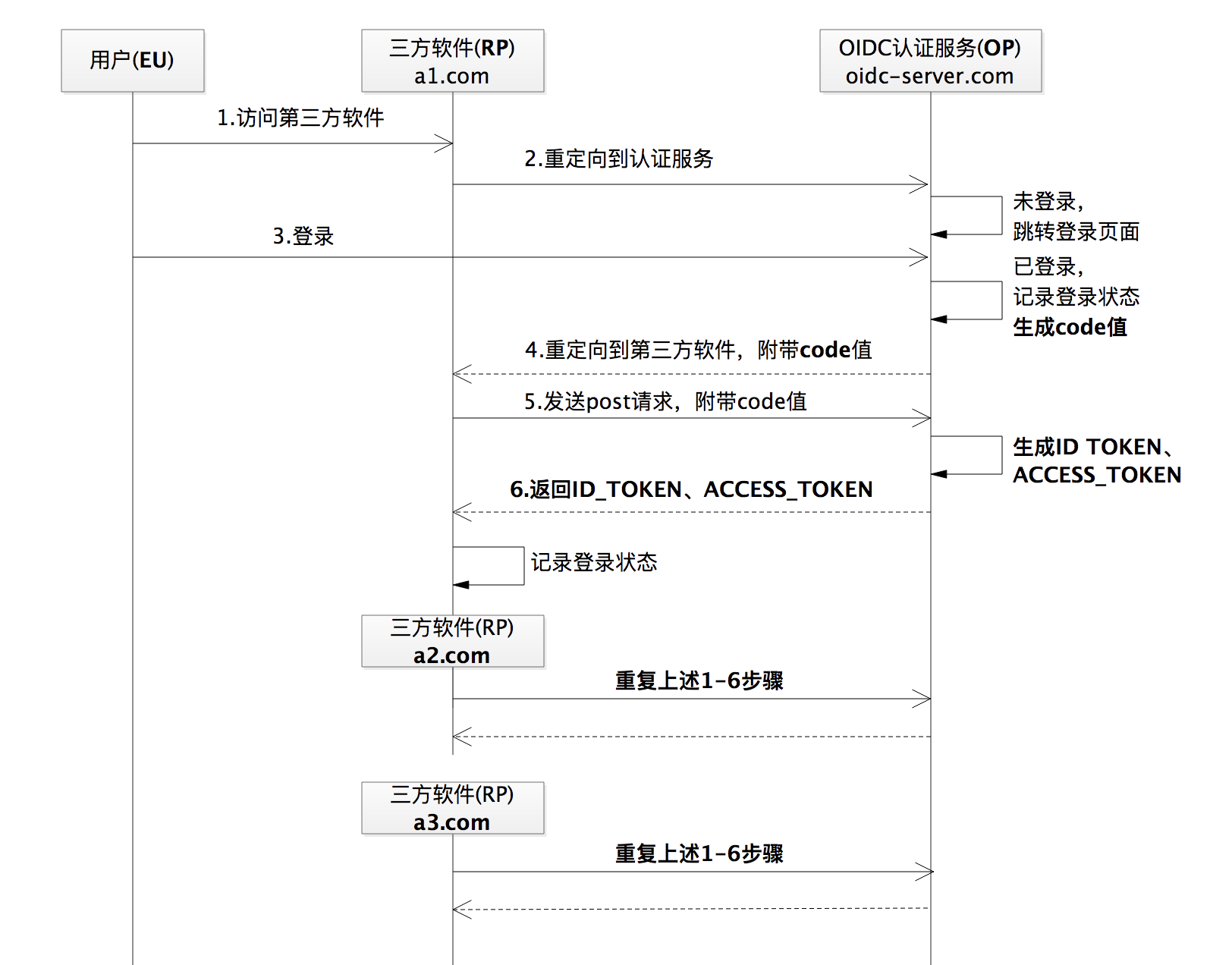 EU、RP 和 OP 这三个角色对于 OIDC 非常重要,我后面也会时常使用简称来描述,希望你能先记住。