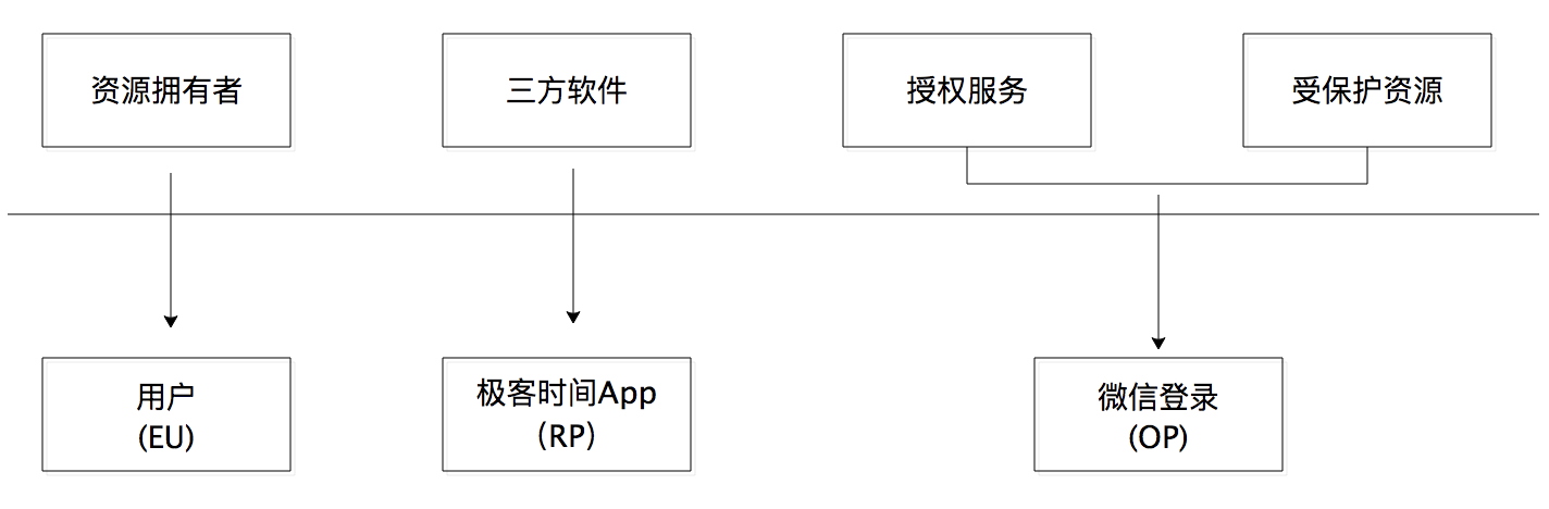 现在,我们就借助极客时间的例子,来看一下 OAuth 2.0 的 4 个角色和 OIDC 的 3 个角色之间的对应关系: