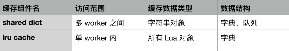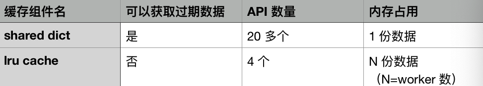 下面这两个简单的表格,可以说明 shared dict 和 lru 缓存的区别: