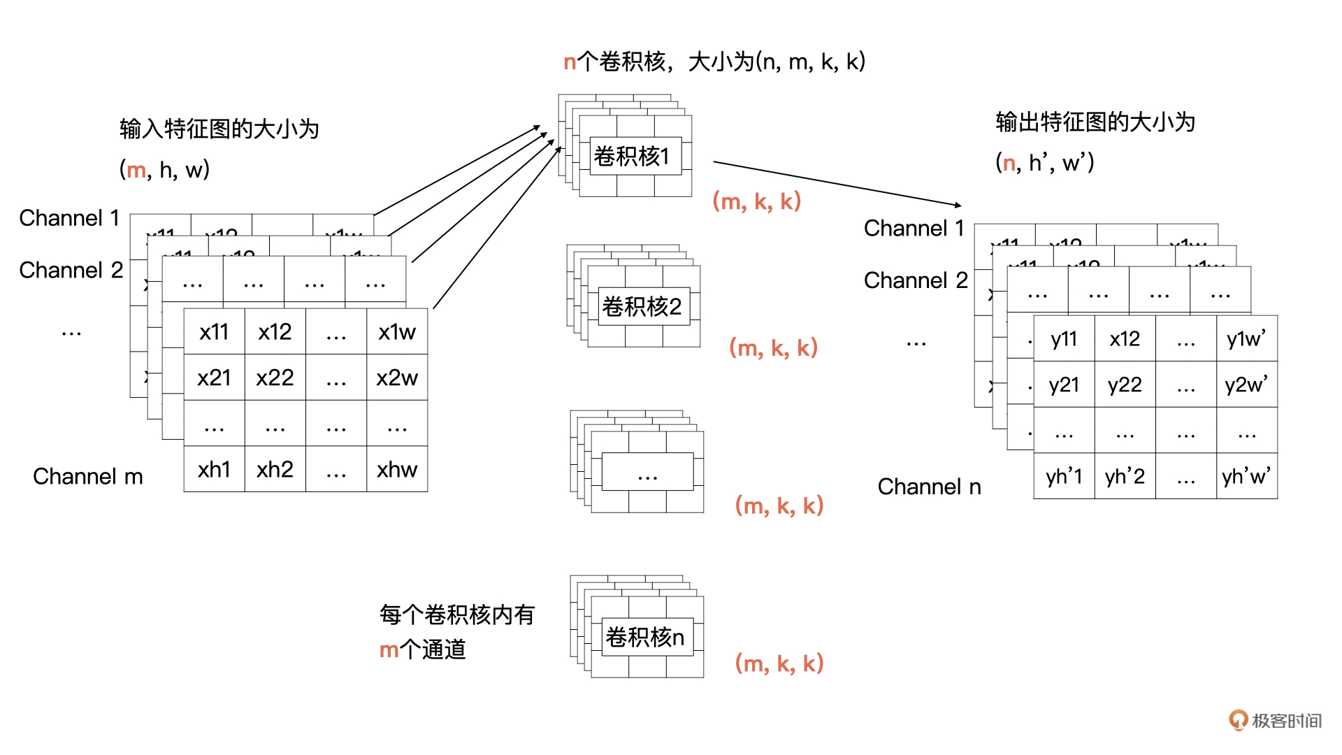 我们先将上面的例子描述为更加通用的形式,输入的特征有m个通道,宽为w,高为h;输出有n个特征图,宽为\(w^{\\prime}\),高为\(h^{\\prime}\);卷积核的大小为kxk。