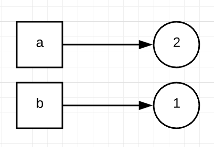 这里的参数传递,使变量a和b同时指向了1这个对象。但当我们执行到b = 2时,系统会重新创建一个值为2的新对象,并让b指向它;而a仍然指向1这个对象。所以,a的值不变,仍然为1。