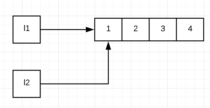 这里l1和l2先是同时指向值为[1, 2, 3]的列表。不过,由于列表可变,执行append()函数,对其末尾加入新元素4时,变量l1和l2的值也都随之改变了。