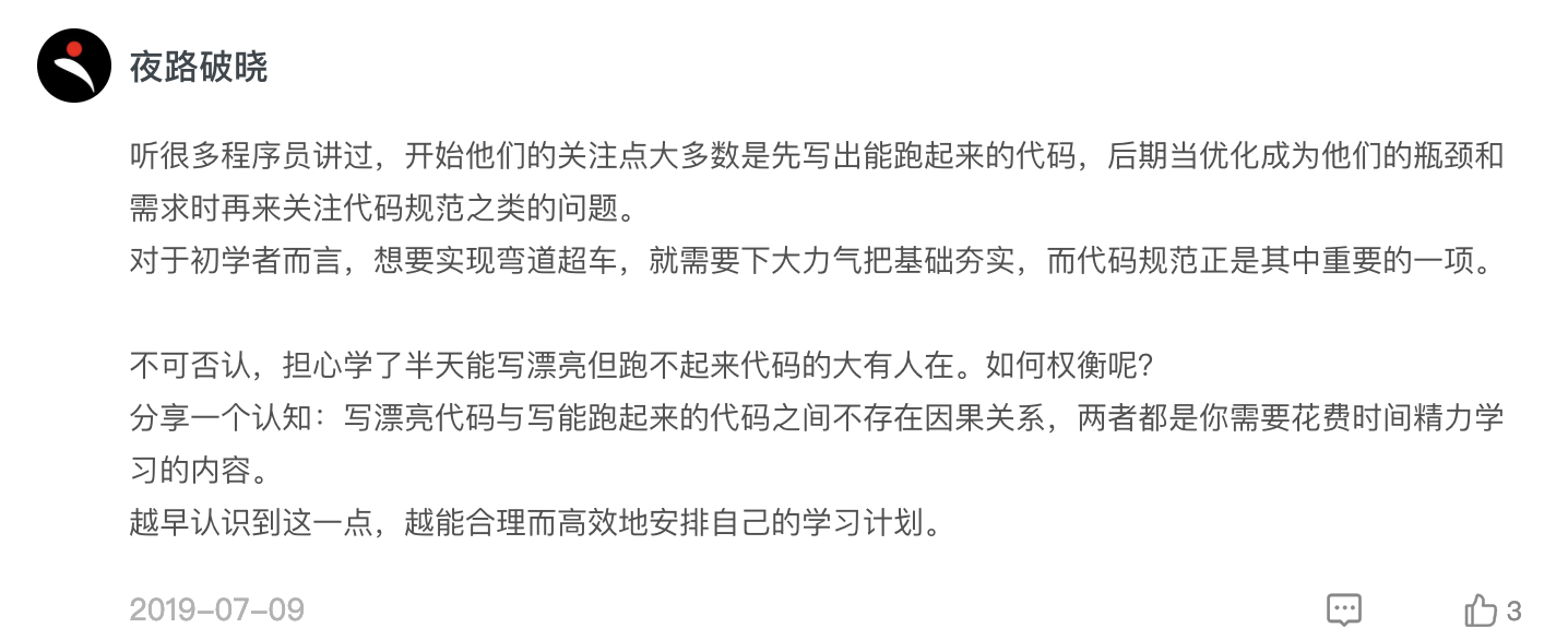 第二个问题,夜路破晓同学提到了很多程序员传授的“经验之谈”,即先写出能跑起来的代码,后期再优化。很明显,这种认知是错误的。我们从一开始写代码时,就必须对功能和规范这两者双管齐下。