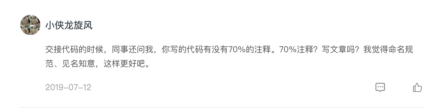 第三个问题,小侠龙旋风同学留言说,自己的同事要求代码中有70%的注释,这显然有点过了。但是反过来说,如果你的代码中没有注释或者注释很少,仅凭规范的变量名肯定是远远不够的。