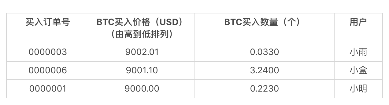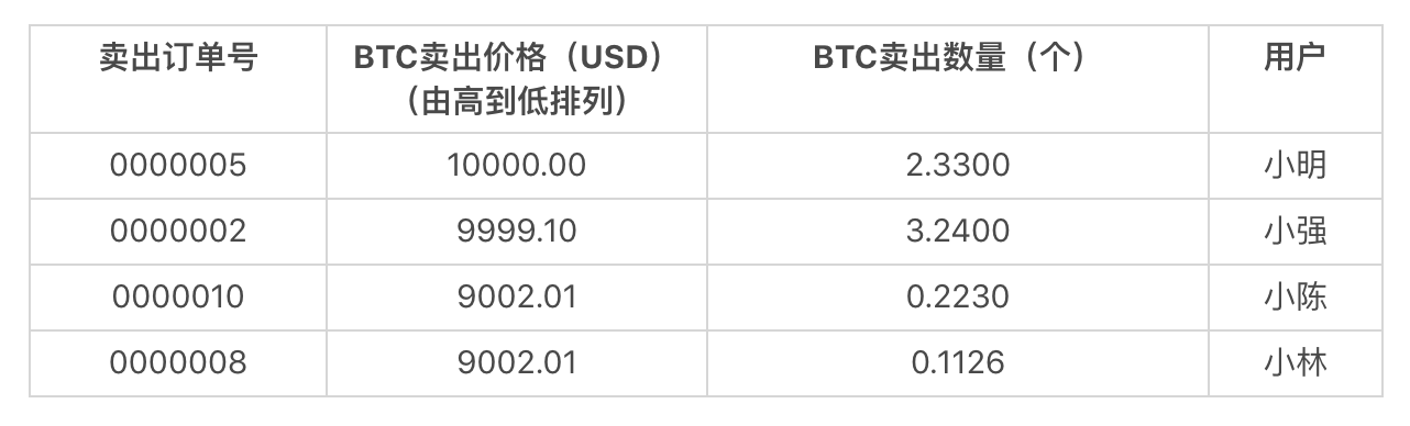 我们把委托表里的具体用户隐去,相同价格的订单合并,就得到了下面这种委托账本。我们主要观察右边的数字部分,其中: