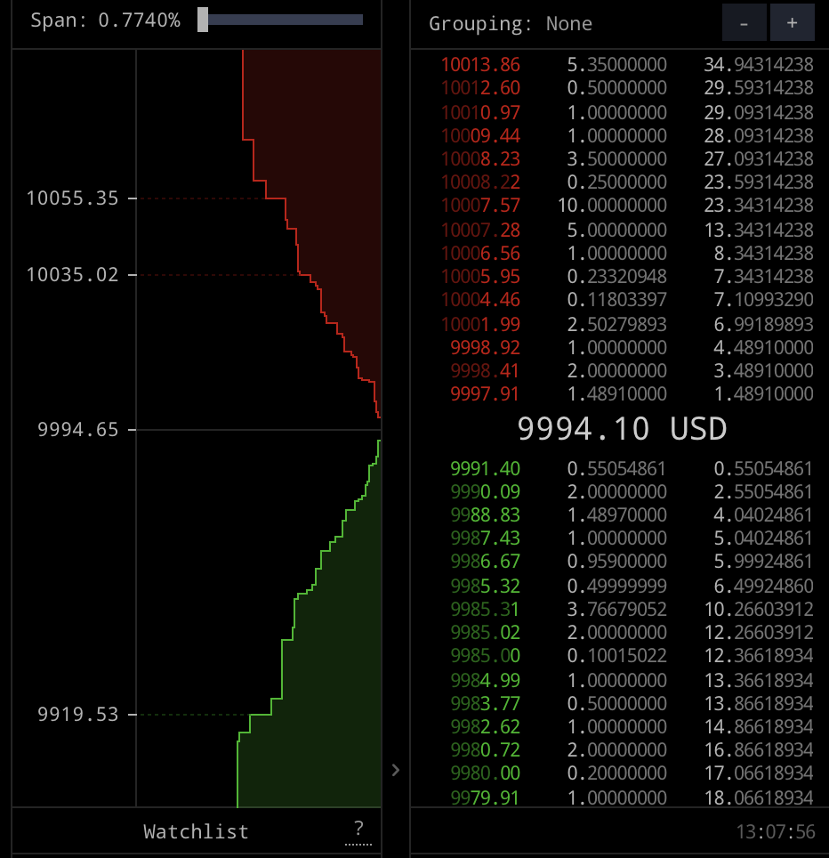 这张图中,最低的卖出价格比最高的买入价格要高 6.51 USD,这个价差通常被称为Spread。这里验证了我们前面提到的,委托账本的价格永不交叉; 同时,Spread很小也能说明这是一个非常活跃的交易所。