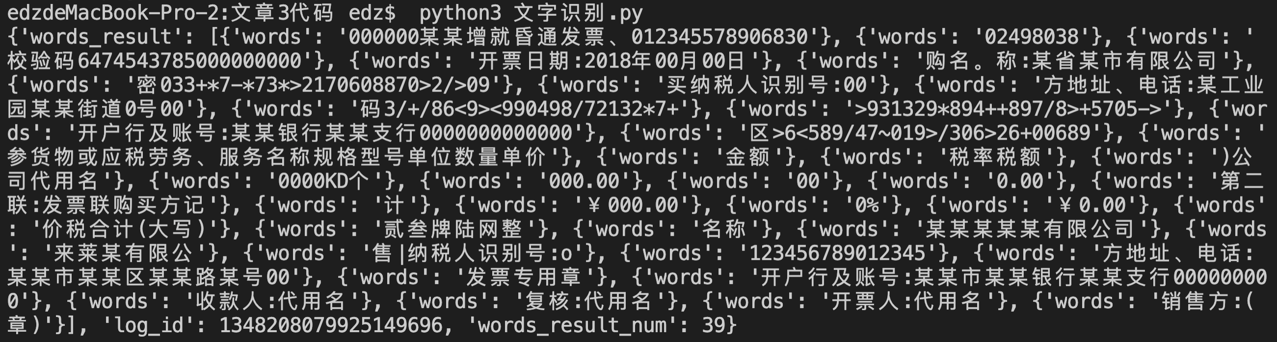 在这段代码里,实现了三个功能,分别是用户验证、读取图片和识别图片。为了让你更直观地看到效果,我来对一张电子发票的图片example.png进行识别。识别结果如下: