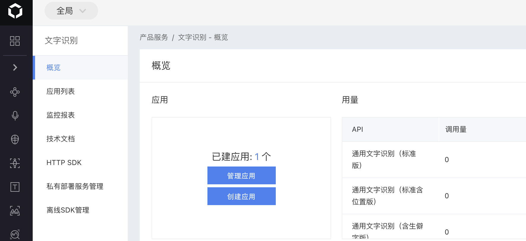 成功登录网站之后,你会进入服务控制台界面,然后选择文字识别功能,再新创建一个文字识别类型的应用。创建应用之后,就可以在服务控制台中的应用列表中查看百度云提供的APP_ID、API_KEY、SECRET_KEY 三个变量。