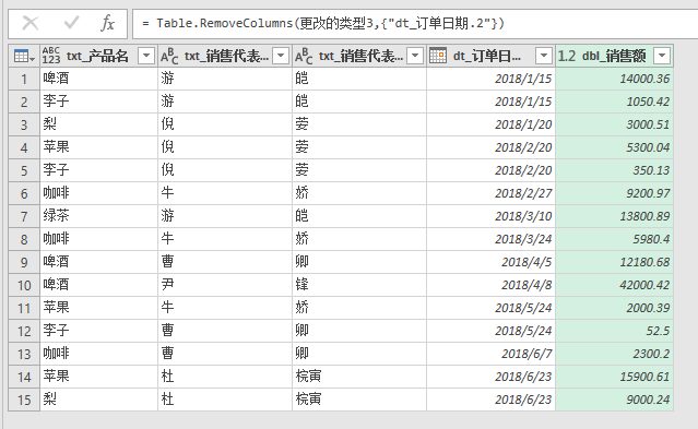 最后,删除“小时”这一列后,订单日期就实现了拆分功能。