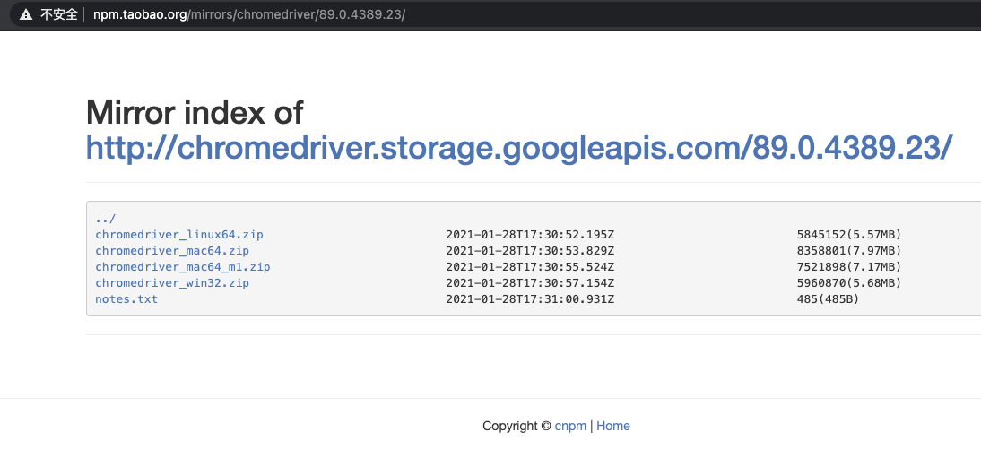 接着,根据我的浏览器版本“89.0”访问“Webdrive”国内的镜像站,下载与浏览器相匹配版本的“Webdriver”。这里要注意,不同的操作系统,“Webdriver”的安装包不同,所以需要你选择对应的操作系统版本。“Webdriver”的下载网页内容截图如下: