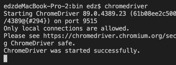 我的Python安装目录是“/Library/Frameworks/Python.framework/Versions/3.7/bin”,因此我就把“chromedriver” 放在这个目录中。放入之后,我就可以在命令行运行“chromedirver”。如果能够正确运行,则会提示运行成功。否则会提示找不到这条命令,你需要再检查一下它被存放的目录。正确运行的截图如下,供你参考。