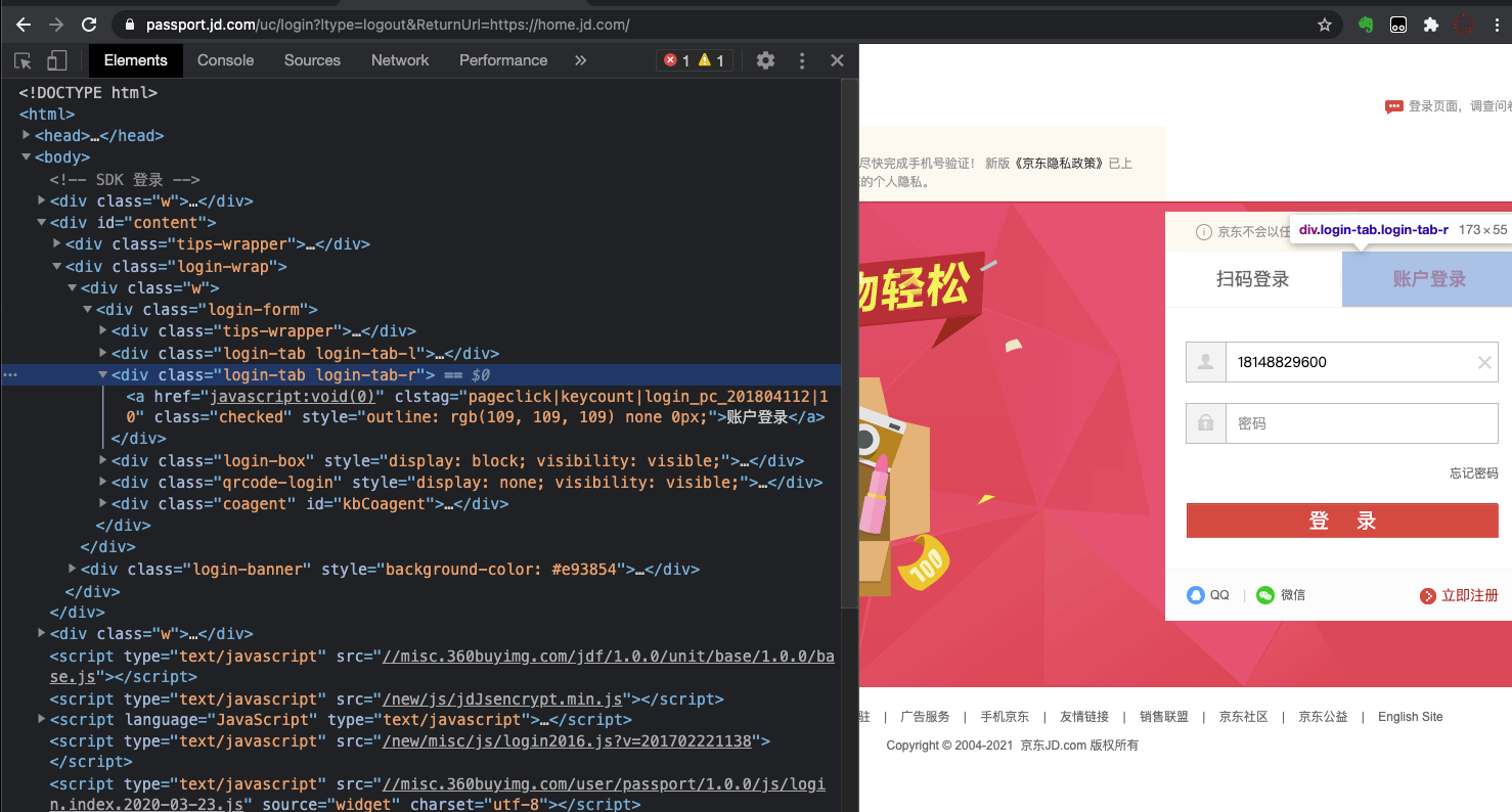 由于京东的登录界面是经过加密的,所以不能使用“requests-html”直接发送“POST”请求来实现登录,这里仍然要继续使用“selenium”获取用户名、密码的输入框,输入之后,模拟点击按钮的“GET”请求到服务器之后,才能实现登录。