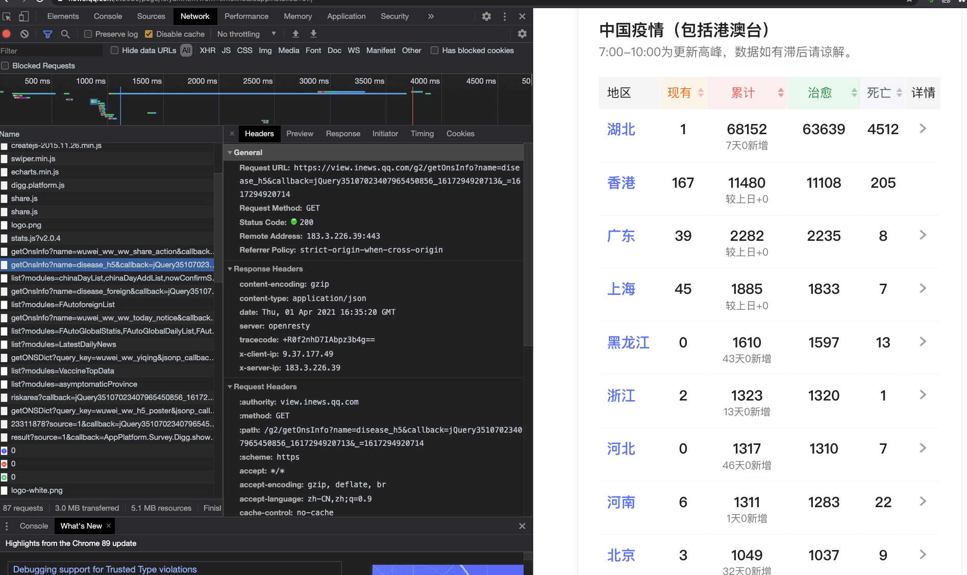 第二步,请求网页。以腾讯疫情实时网页为例,可以在地址栏输入“https://news.qq.com/zt2020/page/feiyan.htm#/”,输入后,调试界面会显示该网页都请求了哪些地址。我把调试页面放在下方供你参考。