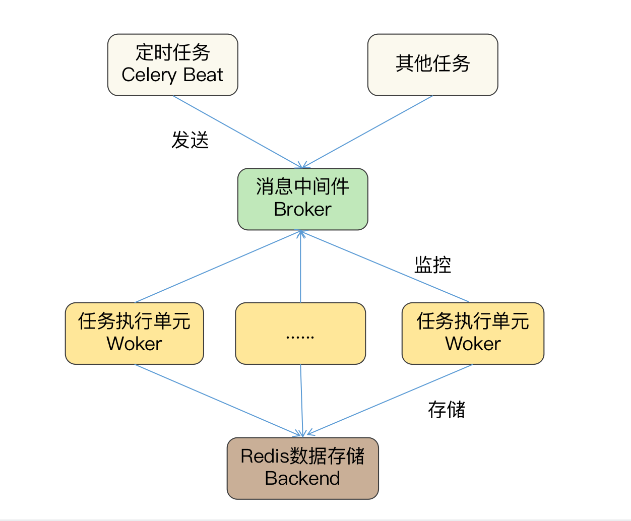 Beat组件编写的代码主要是任务的执行时间和该时间运行的任务名称。而其他两个组件中的Broker承担的是Beat和Worker之间的调度工作,即接收Beat发送的任务,和等待Worker来取任务,因此它和存储定时任务的Backend组件不需要进行编程。