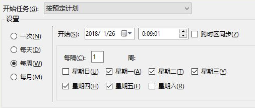- 除了“每天、每月、每周”等比较宽泛的设置,你还可以通过点击“下一步”进行更具体的执行时间设置,比如我希望每周一至周五的00:09:01执行任务,就可以按照下图的方式进行设置。