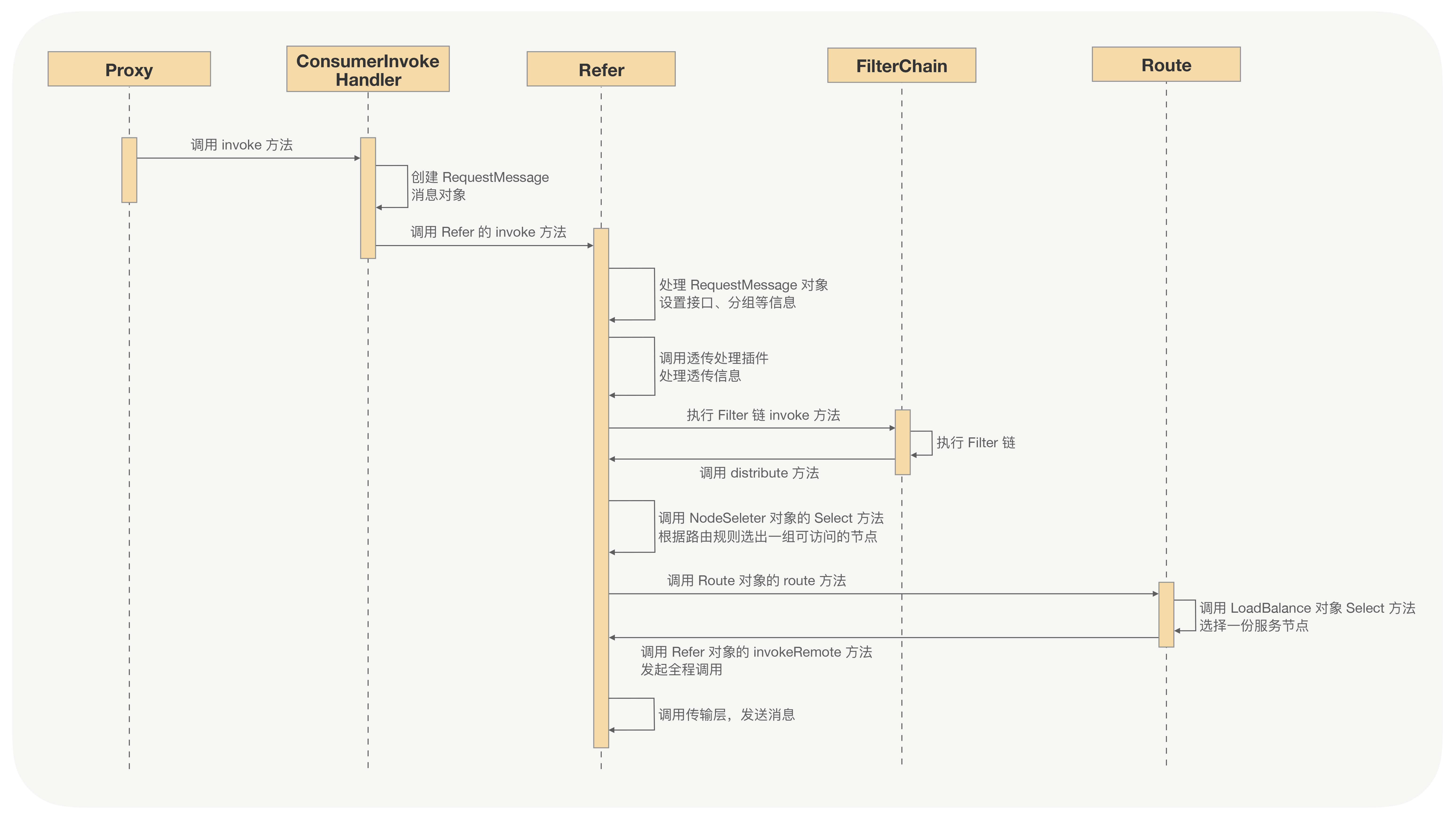 调用端向服务端发起调用时,会先经过动态代理,之后会调用Refer对象的invoke方法,Refer对象会先对要透传的消息进行处理,再执行Filter链,调用端最后一个Filter会根据配置的路由规则选择出符合条件的一组服务端节点,之后调用Route对象的route方法,route方法的内部逻辑会根据配置的负载均衡策略选择一个服务端节点,最后向这个服务端节点发送请求消息。