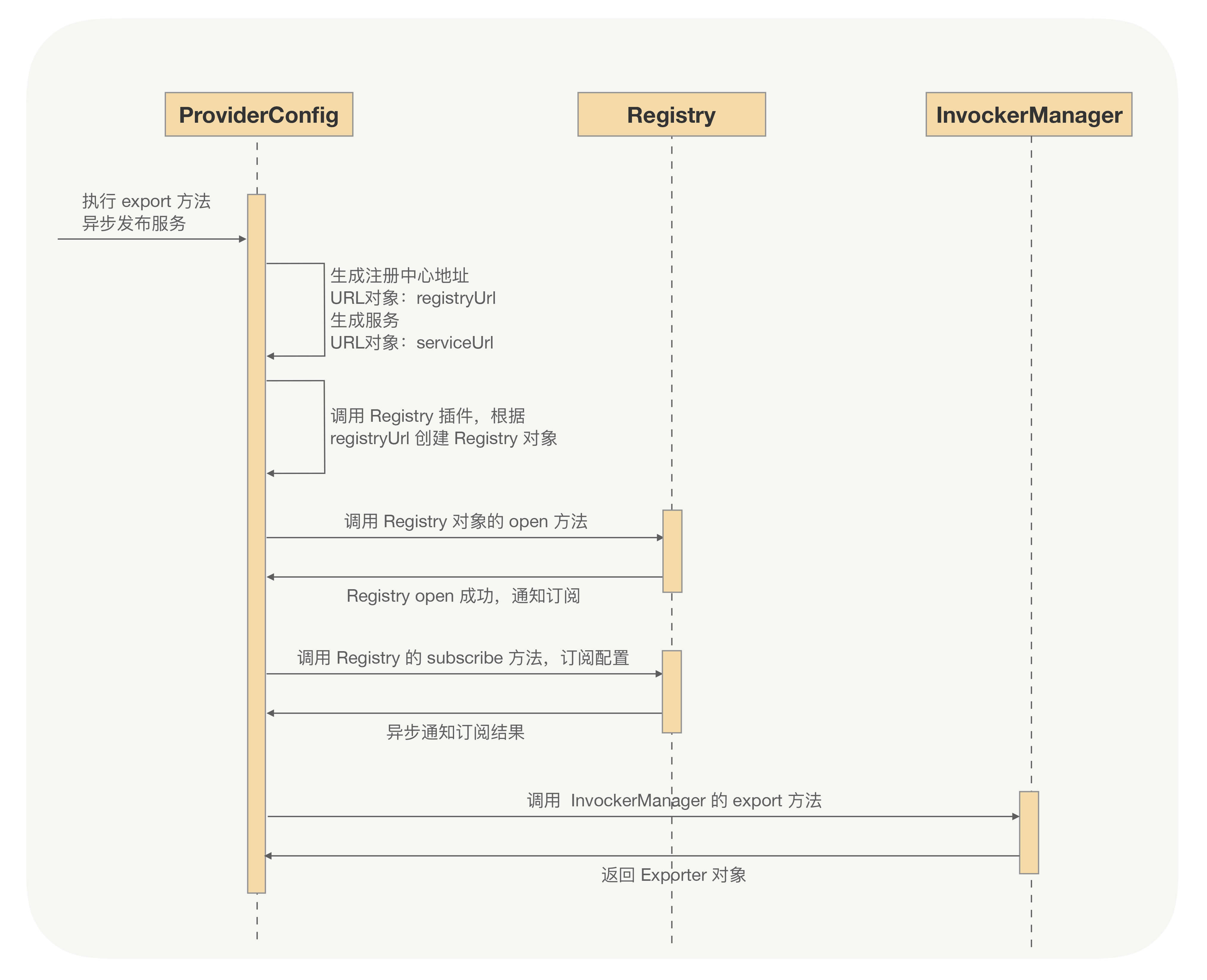 这里的ProviderConfig是服务端的配置对象,其中接口、分组、注册中心配置等等的相关信息都在这个配置类中配置,流程的入口是调用ProviderConfig的export方法,整个流程如下: