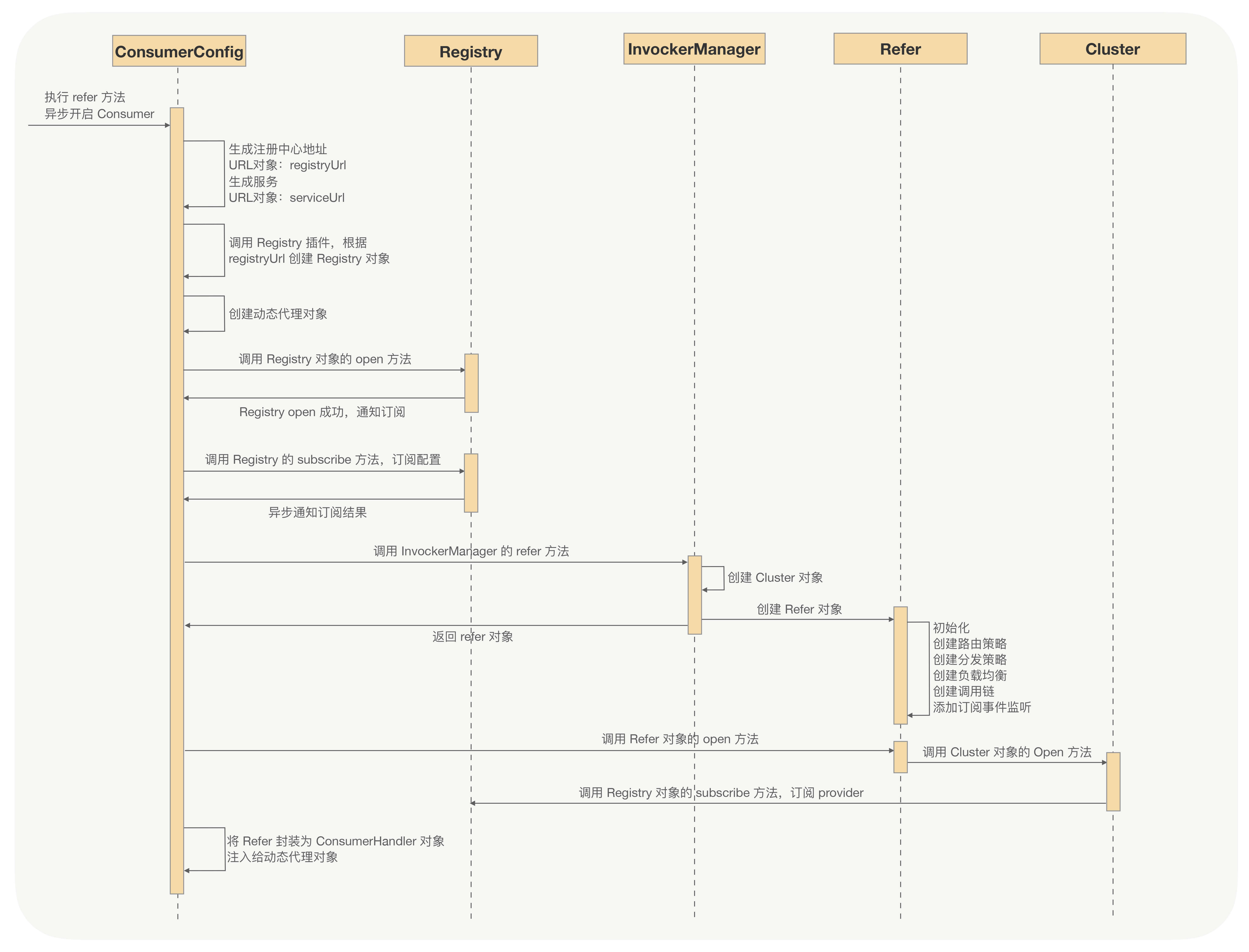 调用端流程的启动入口就是ConsumerConfig对象的refer方法,ConsumerConfig对象就是调用端的配置对象,这里可以看到refer方法的返回值是CompletableFuture,与服务端相同,调用端的启动流程也完全是异步的,下面我们来看下调用端的启动流程。