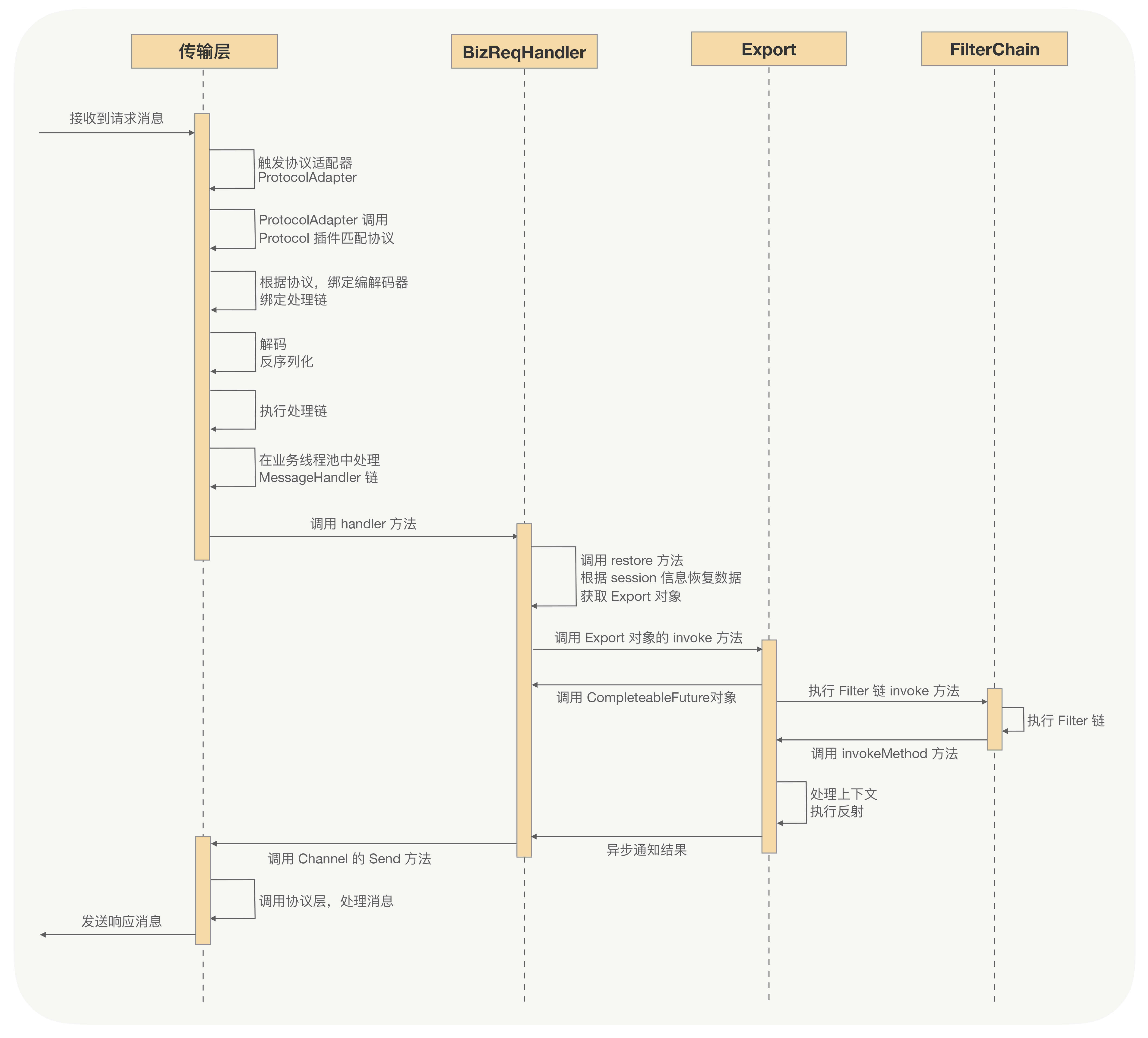 服务端的传输层收到调用端发送过来的请求消息,在对请求消息进行一系列处理之后(如解码、反序列化、协议转换等等),会在业务线程池中处理消息,关键的逻辑就是调用Exporter对象的invoke方法,Exporter对象的invoke方法会执行服务端配置的Filter链,最终通过反射或预编译对象执行业务逻辑,再将最终结果封装成响应消息,通过传输层响应给调用端。