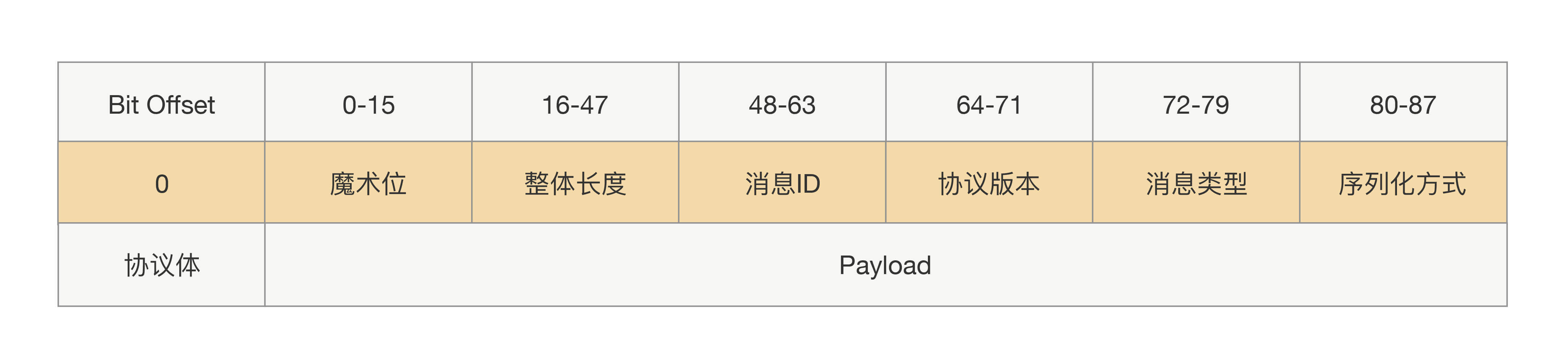 但上面这种协议,只实现了正确的断句效果,在RPC里面还行不通。因为对于服务提供方来说,他是不知道这个协议体里面的二进制数据是通过哪种序列化方式生成的。如果不能知道调用方用的序列化方式,即使服务提供方还原出了正确的语义,也并不能把二进制还原成对象,那服务提供方收到这个数据后也就不能完成调用了。因此我们需要把序列化方式单独拿出来,类似协议长度一样用固定的长度存放,这些需要固定长度存放的参数我们可以统称为“协议头”,这样整个协议就会拆分成两部分:协议头和协议体。
