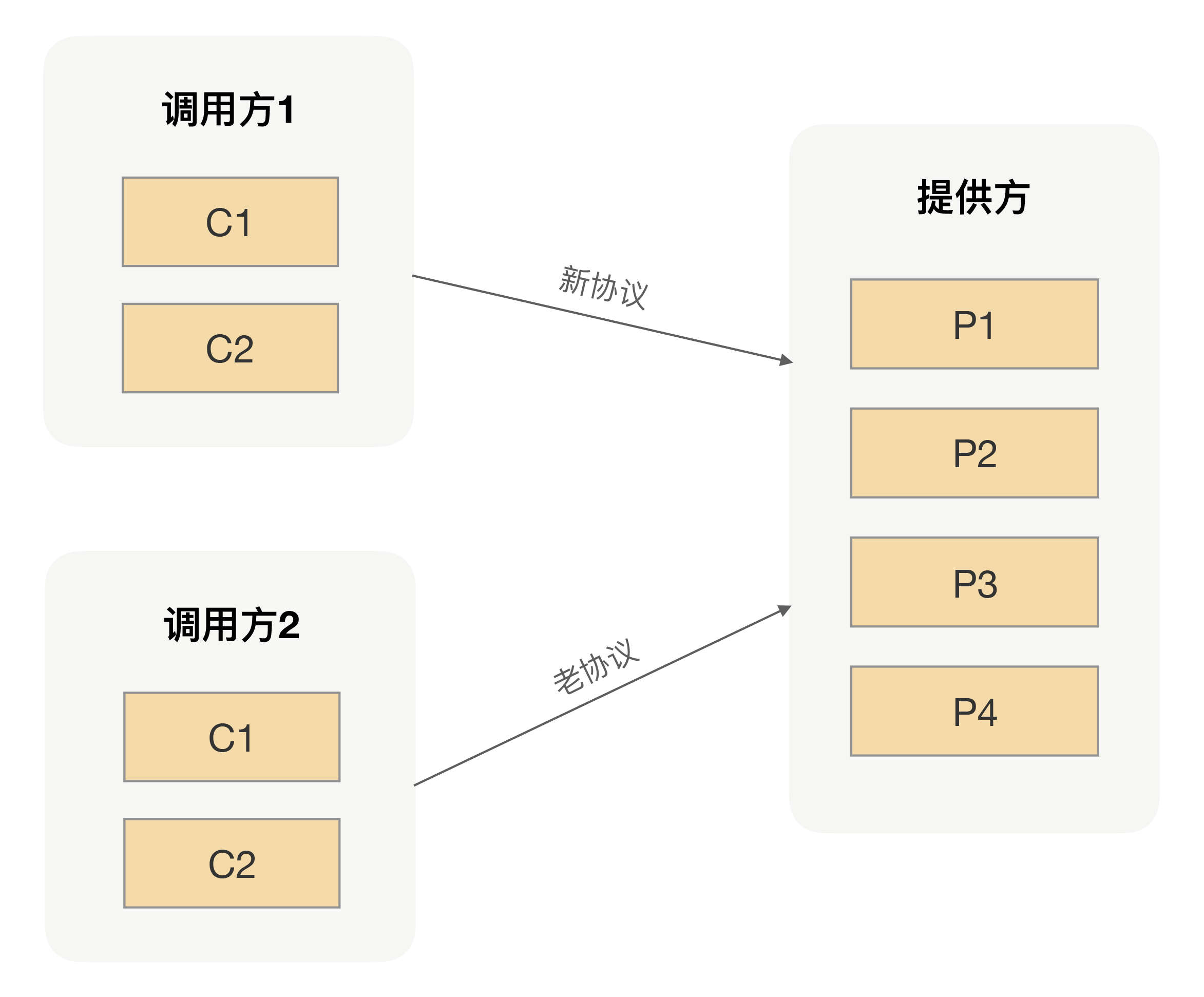 那有没有更好的方式可以让应用上线一次就可以完成新老RPC的切换呢?关键就在于要让新的RPC能同时支持多种RPC调用,当一个调用方切换到新的RPC之后,调用方和服务提供方之间就可以用新的协议完成调用;当调用方还是用老的RPC进行调用的话,调用方和服务提供方之间就继续沿用老的协议完成调用。对于服务提供方来说,所要处理的请求关系如下图所示: