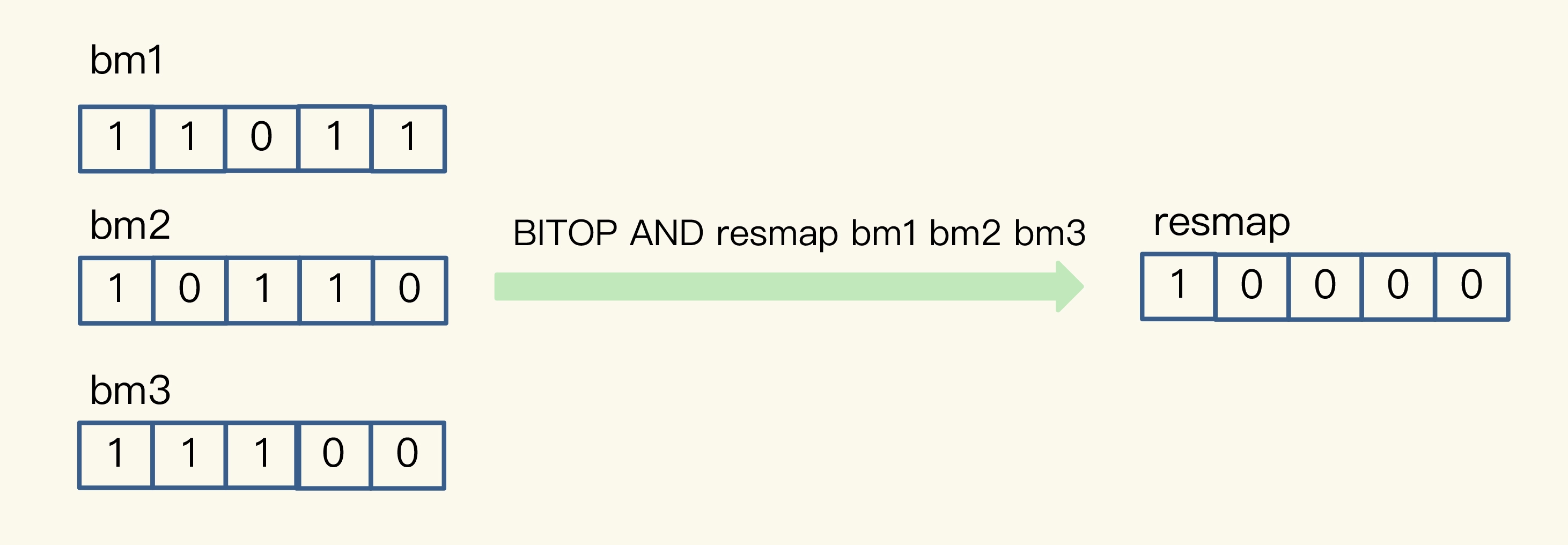 我以按位“与”操作为例来具体解释一下。从下图中,可以看到,三个 Bitmap bm1、bm2 和 bm3,对应 bit 位做“与”操作,结果保存到了一个新的 Bitmap 中(示例中,这个结果 Bitmap 的 key 被设为“resmap”)。