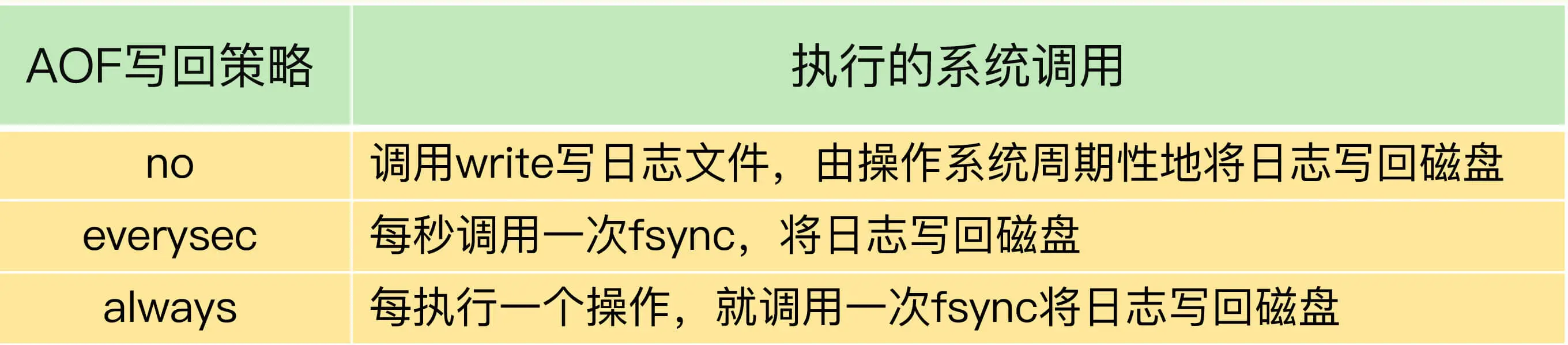 我在前面讲过,为了保证数据可靠性,Redis 会采用 AOF 日志或 RDB 快照。其中,AOF 日志提供了三种日志写回策略:no、everysec、always。这三种写回策略依赖文件系统的两个系统调用完成,也就是 write 和 fsync。