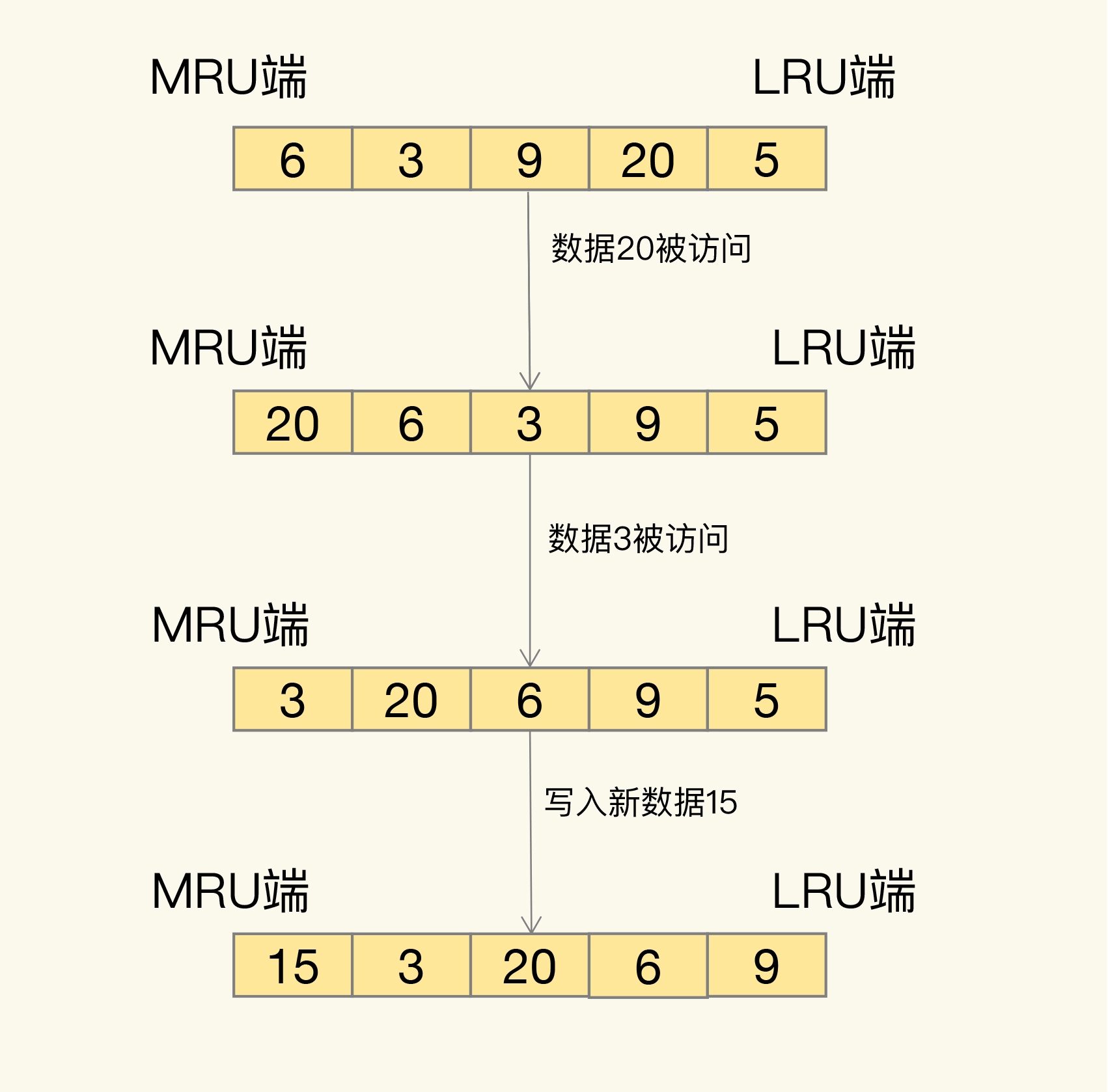 我们现在有数据 6、3、9、20、5。如果数据 20 和 3 被先后访问,它们都会从现有的链表位置移到 MRU 端,而链表中在它们之前的数据则相应地往后移一位。因为,LRU 算法选择删除数据时,都是从 LRU 端开始,所以把刚刚被访问的数据移到 MRU 端,就可以让它们尽可能地留在缓存中。