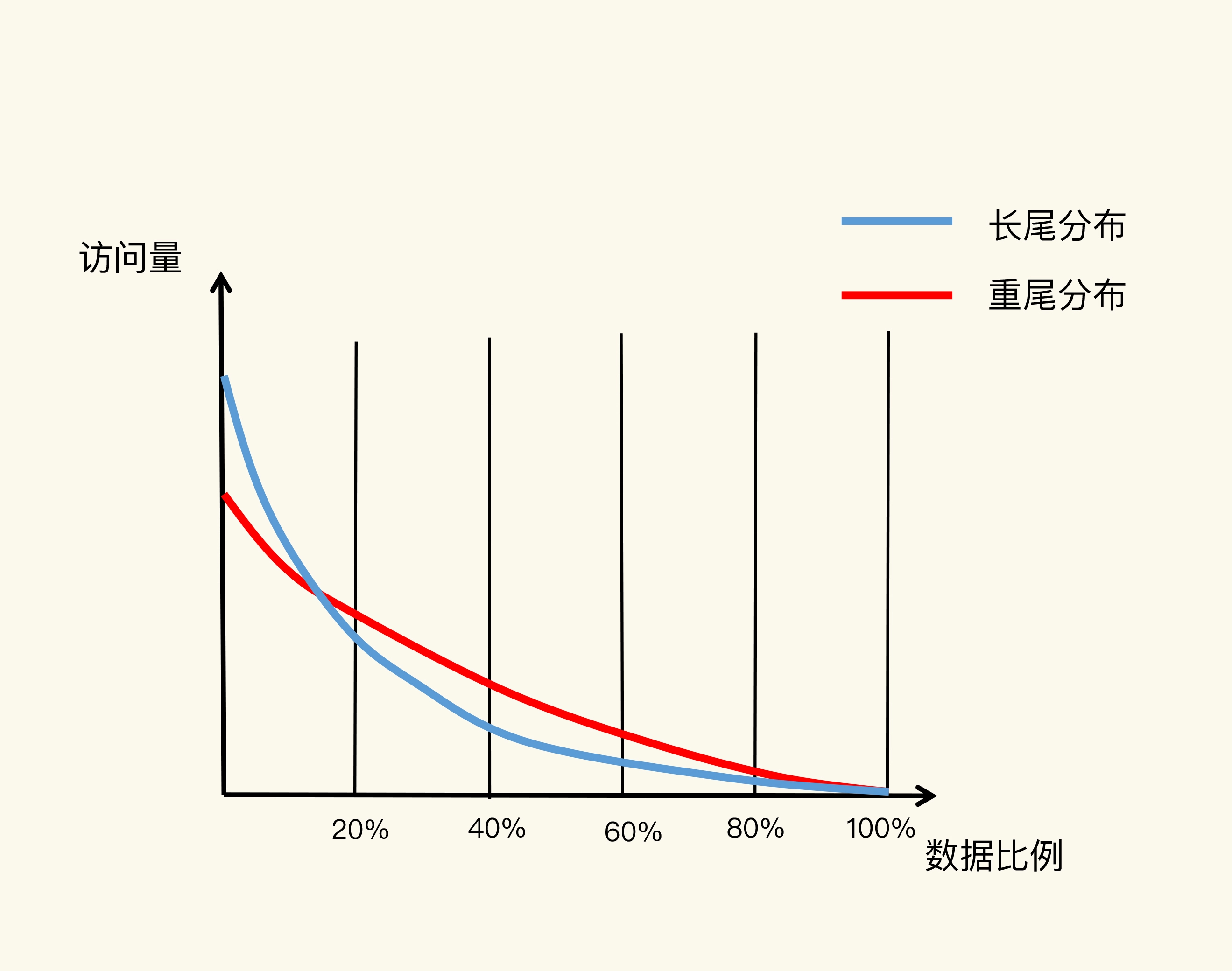 我们先看看蓝线。它表示的就是“八二原理”,有 20% 的数据贡献了 80% 的访问了,而剩余的数据虽然体量很大,但只贡献了 20% 的访问量。这 80% 的数据在访问量上就形成了一条长长的尾巴,我们也称为“长尾效应”。