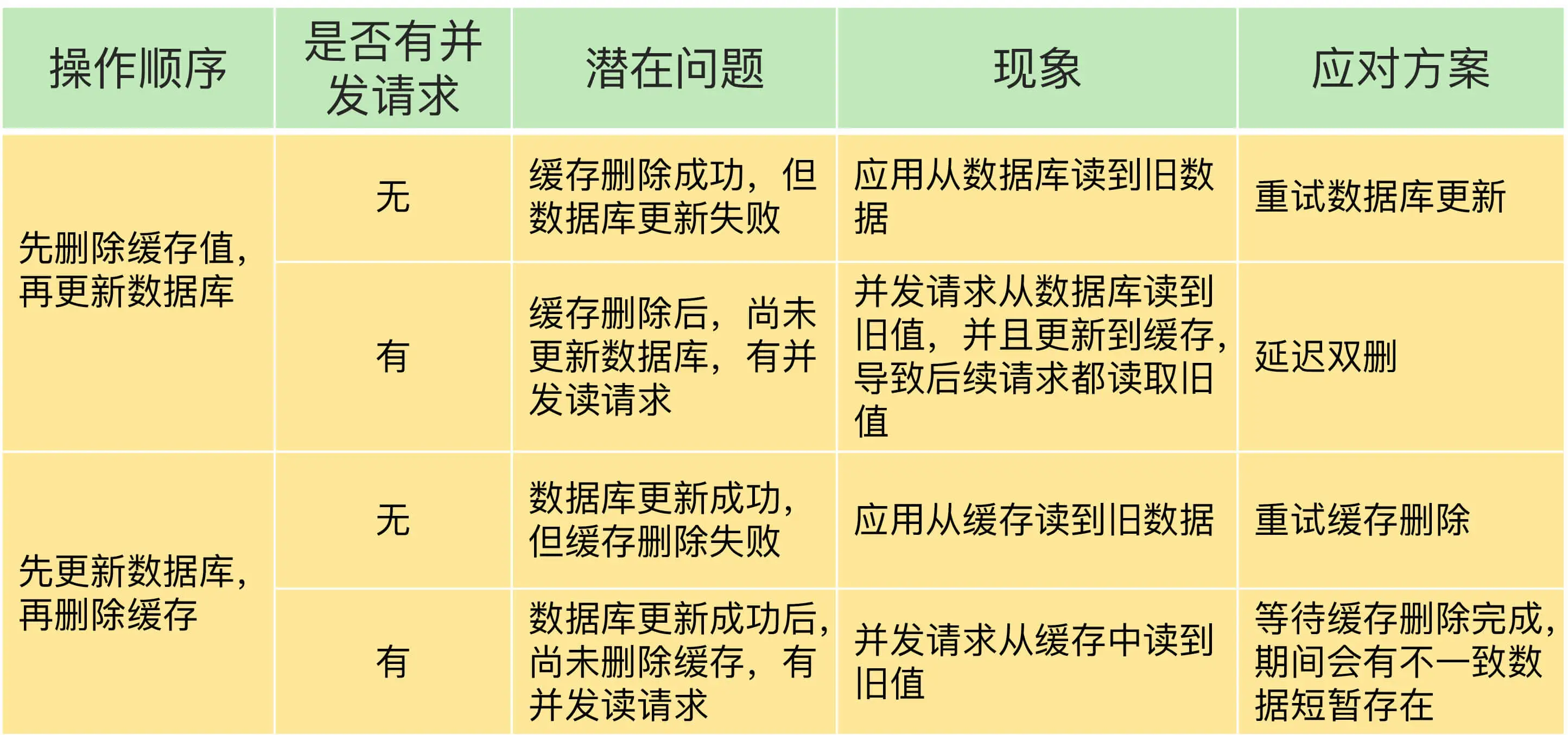 好了,到这里,我们可以看到,在更新数据库和删除缓存值的过程中,无论这两个操作的执行顺序谁先谁后,只要有一个操作失败了,就会导致客户端读取到旧值。我画了下面这张表,总结了刚刚所说的这两种情况。