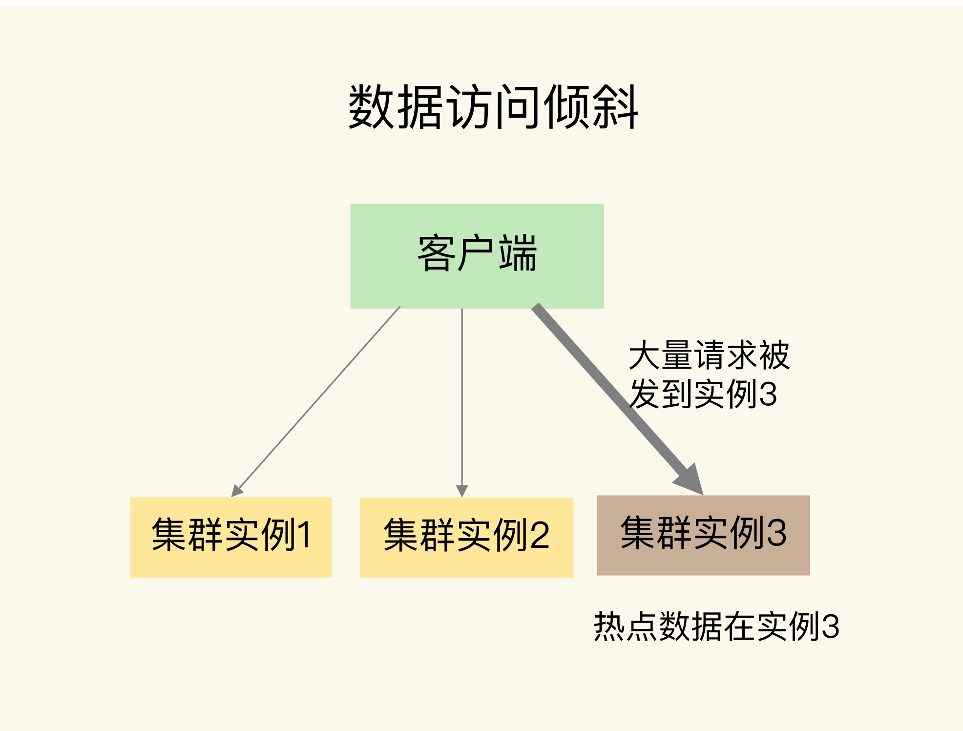 一旦热点数据被存在了某个实例中,那么,这个实例的请求访问量就会远高于其它实例,面临巨大的访问压力,如下图所示: